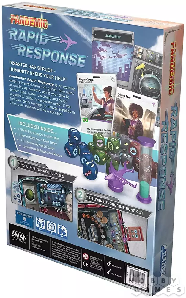 Это гонка на пределе возможностей. Бросайте кубики, чтобы производить припасы, управляйте самолётом и доставляйте грузы в охваченные кризисом города. Песочные часы неумолимо отсчитывают секунды, а новые катастрофы возникают быстрее, чем вы успеваете закончить с предыдущей проблемой. Сможете ли вы действовать достаточно слаженно, чтобы спасти тех, кто зависит от вашей помощи?