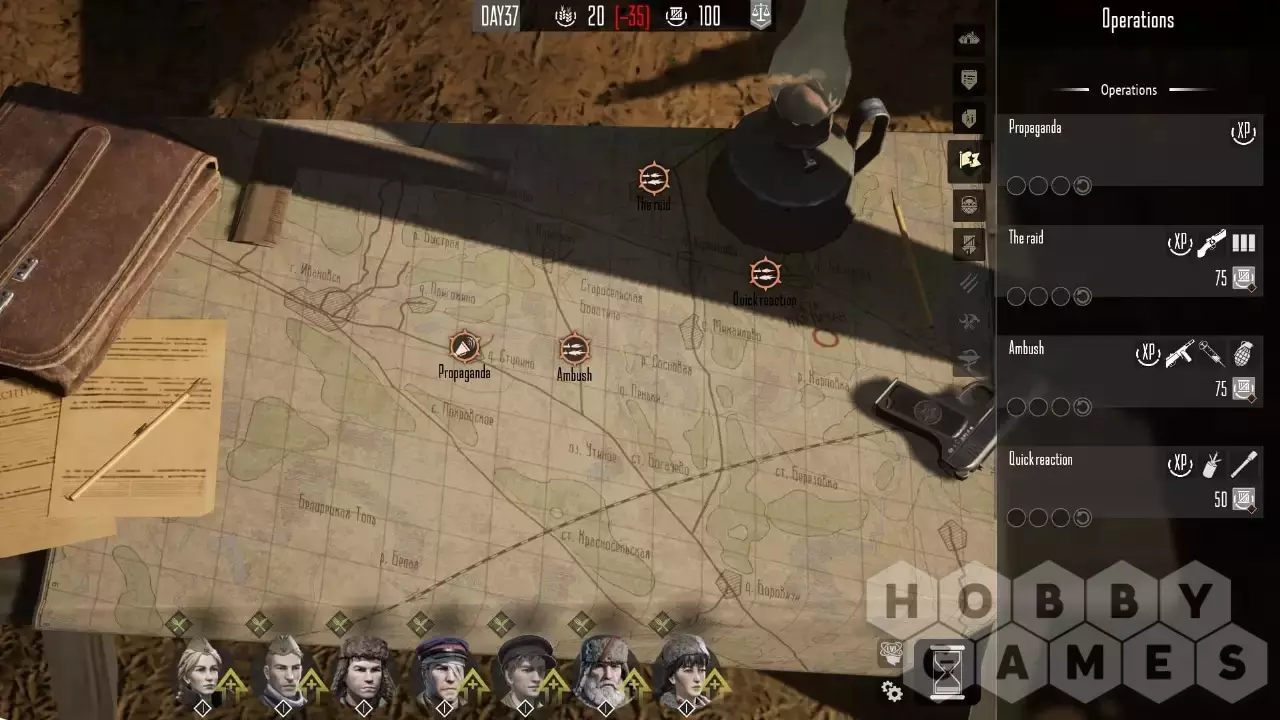 - Партизанские будни. В перерывах между миссиями погружайтесь в рутину партизанского быта — развивайте базу, готовьтесь к следующим заданиям, следите за тем, чтобы у вас было достаточно ресурсов для выживания. Поддерживайте боевой дух партизан. Исследуйте соседние регионы, используйте каждую возможность нанести удар по врагу.