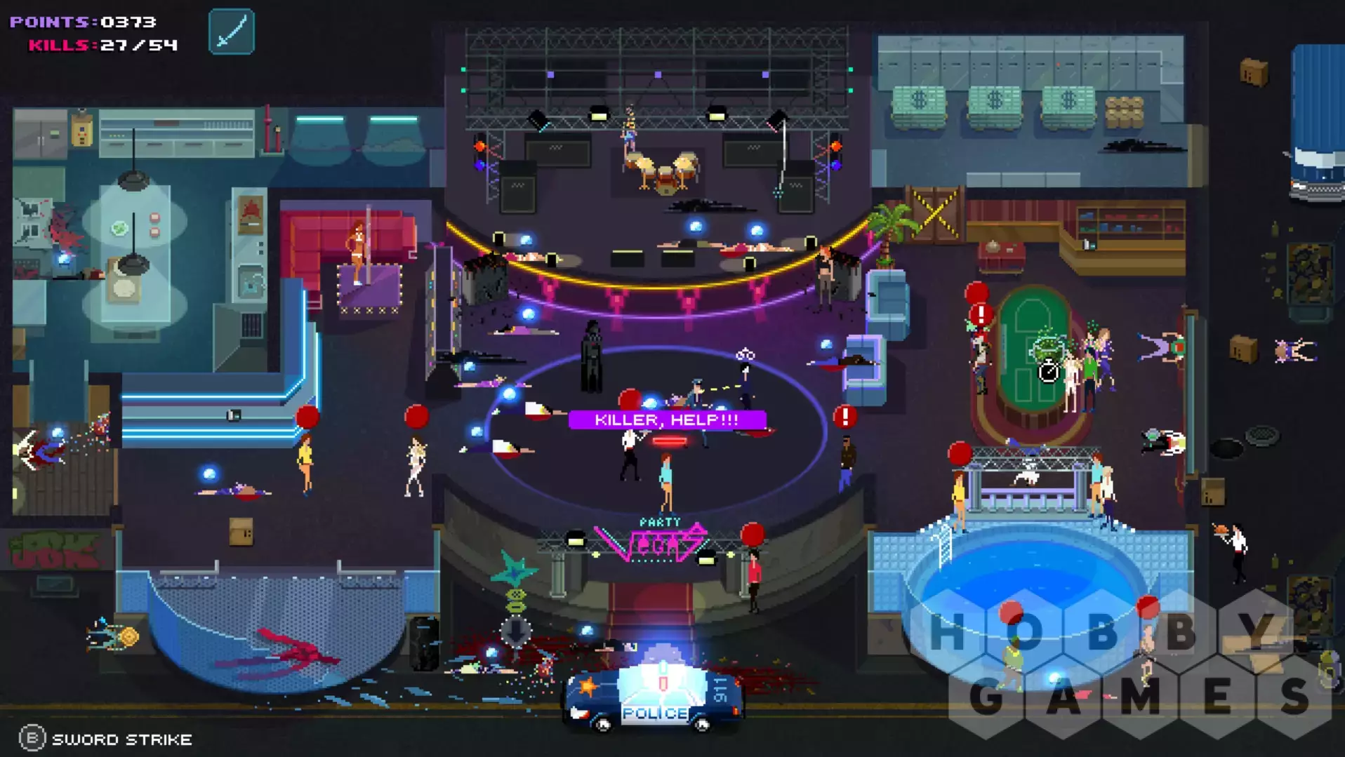 Party Hard has semi-procedurally generated environments and focuses on unique ways of killing people. In the greatest traditions of stealth games, your main goal is not to get caught while silently picking off unsuspecting victims one by one. Dancing and blending in in a suspicious situation is key.