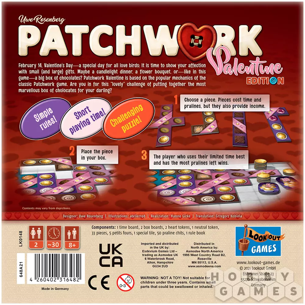 В дуэльной игре Patchwork игрокам предстоит сшить одеяло из различных лоскутков. Чтобы это сделать, потребуется не столько время, сколько способность планировать, творчески подходить к задаче и немного удачи. У игроков есть личное поле с квадратиками, которые предстоит заполнять лоскутами различных размеров и форм. Главная цель – оставить как можно меньше пустых клеток. Тайлы можно купить за пуговицы, которые являются валютой игры.