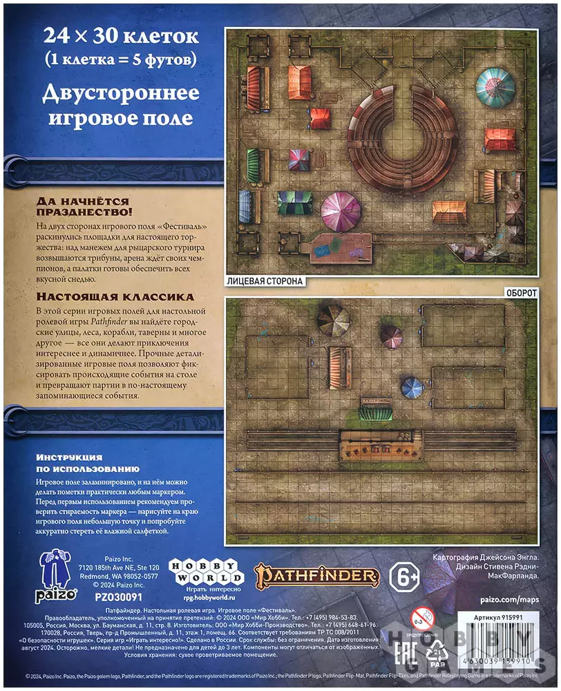 Несмотря на то, что Голарион, мир Pathfinder, таит в себе множество опасностей, ничто человеческое ему не чуждо: есть в нём и приятные моменты веселья и радости. Какой же простой житель не знает о фестивалях и не ждёт их с горящими глазами? На фестивалях встречаются друг с другом люди разных культур, с разными целями, и если кого-то атмосфера праздника окутывает и расслабляет, то другие вполне могут воспользоваться этой расслабленностью для не самых приятных целей. Устроить суматоху? Своровать кошель из кармана зазевавшейся торговки? А может даже найти среди других посетителей кого-то, кто согласится поучаствовать в незаконном мерзком дельце? Что бы вы там ни придумали, но это двухстороннее игровое поле поможет вам создать необходимую для погружения атмосферу.