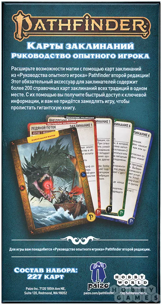 Чтобы узнать важную информацию, больше нет необходимости страницу за страницей листать громадную книгу правил и искать "то самое" заклинание! Благодаря картам заклинаний из "Руководства опытного игрока" Pathfinder, ваши магические возможности вырастут в разы. Набор удобно помещается в руке и содержит не менее двухсот карт со справочной информацией по заклинаниям всех традиций!