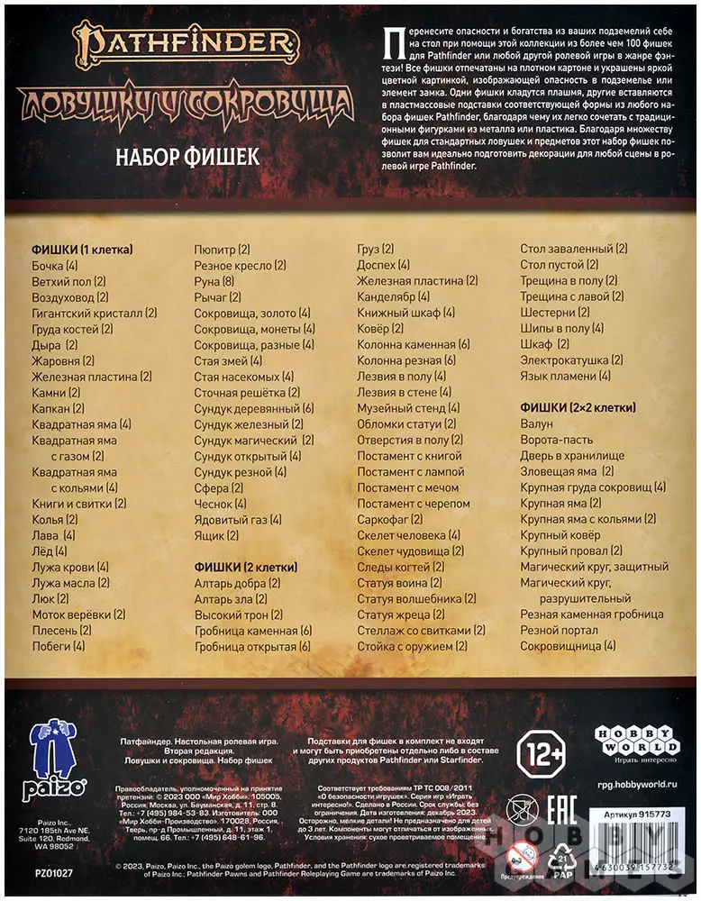 С многообразием фишек, изображающих тайные и опасные ловушки и драгоценности, этот набор станет идеальным для создания живых и красочных декораций и своих собственных сценариев в ролевой игре Pathfinder. Отправляйтесь в следующее приключение с этим увлекательным комплектом фишек и сделайте игру по-настоящему незабываемой!