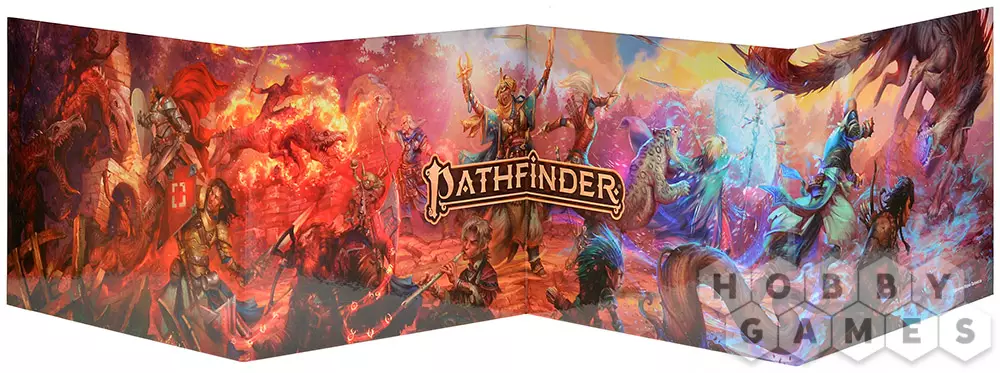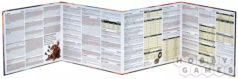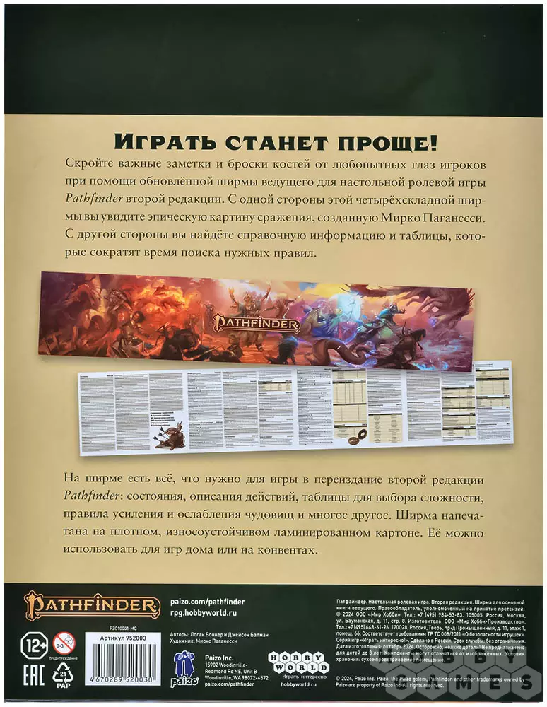 Изнанка ширмы тематически изображает сражение, а автором этой шикарной иллюстрации является Мирко Паганесси. Подобное визуальное сопровождение придаст атмосферы вашей игре и наверняка вдохновит на собственные свершения. Сторона ведущего содержит в себе разнообразные таблицы и данные – о состояниях, действиях и правилах в тех или иных ситуациях. Это абсолютный мастхэв для всех, кто проводит настольные ролевые игры по Pathfinder. А качественное покрытие и износоустойчивый материал гарантируют этой четырёхскладной ширме долговечность.