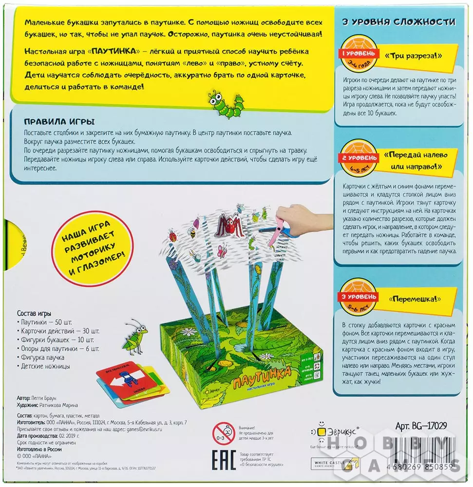 Маленькие букашки запутались в паутинке. С помощью ножниц освободите всех букашек, но так, чтобы не упал паучок. Осторожно, паутинка очень неустойчивая! Настольная игра "Паутинка" - лёгкий и приятный способ научить ребёнка безопасной работе с ножницами, понятиям "лево" и "право", устному счёту. Также она развивает мелкую моторику и глазомер. Дети научатся соблюдать очерёдность, аккуратно брать по одной карточке, делиться и работать в команде!
