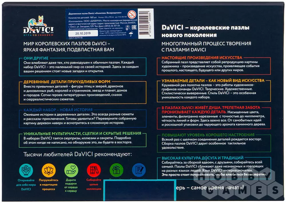 Добро пожаловать в удивительный мир художественных деревянных пазлов от компании DaVICI. Любовь к пазлам выходит на новый уровень и удовольствие от процесса может увлечь за собой даже тех, кого раньше не тянуло собирать пазлы. Чарующие формы деталей, прекрасные картины и натуральное дерево создают уникальные и неповторимые пазлы DaVICI. Каждый пазл полон загадок, отсылок и сюрпризов, которые будут открываться вам по мере сборки картины!