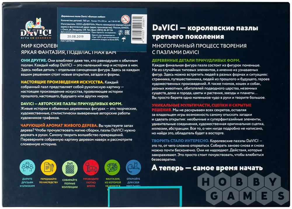 Добро пожаловать в удивительный мир художественных деревянных пазлов от компании DaVICI. Любовь к пазлам выходит на новый уровень и удовольствие от процесса может увлечь за собой даже тех, кого раньше не тянуло собирать пазлы. Чарующие формы деталей, прекрасные картины и натуральное дерево создают уникальные и неповторимые пазлы DaVICI. Каждый пазл полон загадок, отсылок и сюрпризов, которые будут открываться вам по мере сборки картины!