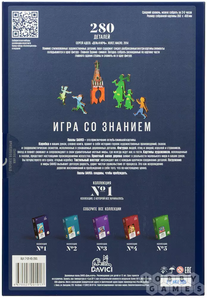 Вам предстоит собрать картину художника Сергея Адеева "День и ночь". Главные достопримечательности Москвы оказались будто в сказке, под огромным волшебным зонтом, который чётко обозначает границы дня и ночи. Среди деталей пазла вы найдёте множество забавных фигурок, начиная от рыб, цветов, птиц и заканчивая узнаваемыми зданиями столицы.