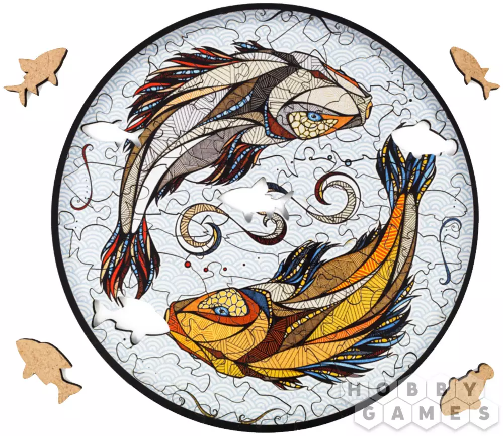 Деревянный пазл для детей и взрослых, фигурный пазл с уникальными деталями Eco Wood Art "Рыбы Карпы Кои" размера S – это настоящая головоломка, ваша ловкость может пригодиться в сборке. Пазл изготовлен по оригинальной иллюстрации знаменитого художника Андреаса Прайса.
