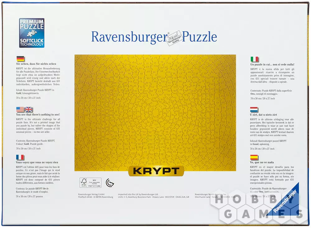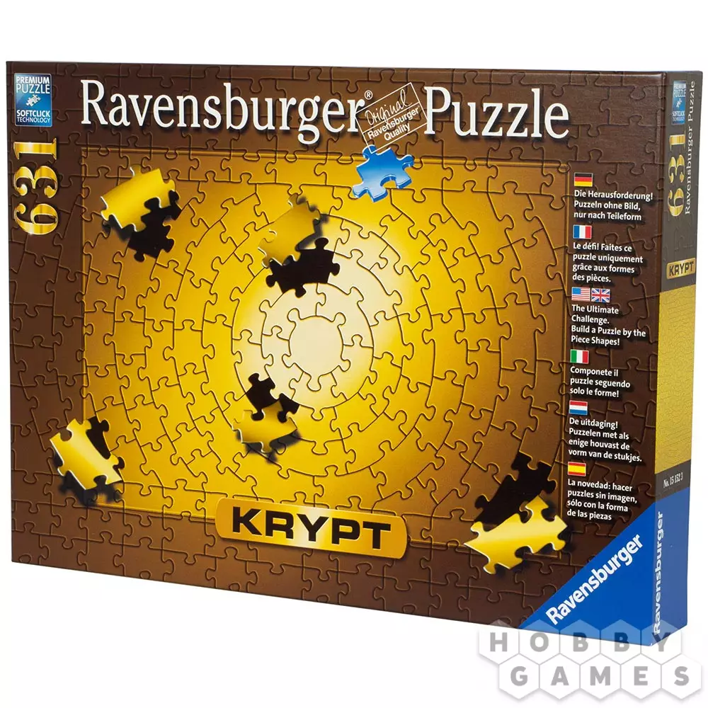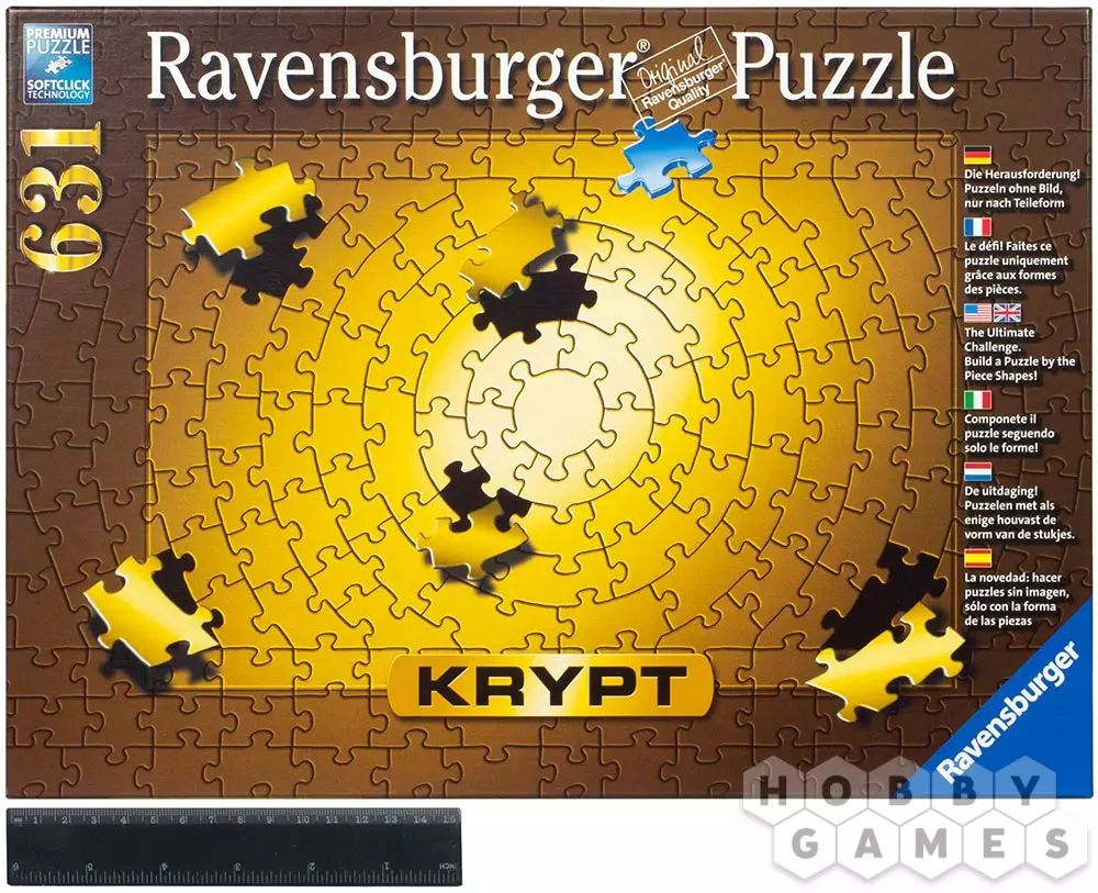 Пазлы серии Krypt – это сложные моноцветные картины с вырезкой по спирали (в центре пазла круглый элемент, остальные выкладываются вокруг него). В этом пазле 631 элемент аристократического золотого цвета, и собрать их все в единое целое будет непросто даже тем, кто давно увлекается пазлами.