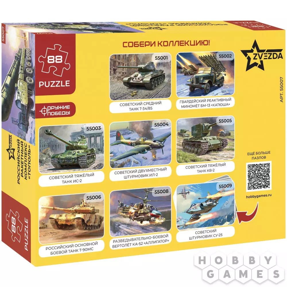 Увлекаетесь сборными моделями? Интересуетесь историей и военной техникой? А может, вас просто увлекает методическое собирание мелких деталей в единую картинку? Если хотя бы один из пунктов попал в точку, вам наверняка придутся по вкусу пазлы от Zvezda! Благодаря им вы отправитесь в увлекательное путешествие сквозь время. Легендарные танки, знаменитые истребители, скоростные штурмовики – теперь к каждой уже имеющейся в вашей коллекции сборной модели вы сможете добавить тематический пазл! А профессиональные иллюстрации Андрея Жирнова помогут создать исторически достоверную атмосферу – ведь каждый элемент, каждая линия этой головоломки пропитаны духом эпохи. Вы будете не просто соединять детали – вам предстоит изучать инженерные решения прошлого, тренировать внимательность и получать ни с чем не сравнимое удовольствие от создания картины своими руками.