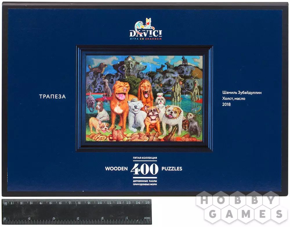 Как на самой картине, так и в деревянных фрагментах пазла Вы найдёте множество пород собак в самых разных ситуациях и позах. Попробуйте отыскать их всех и назвать каждую породу!