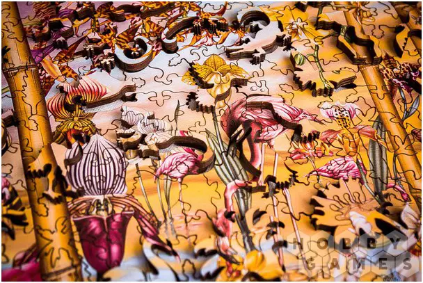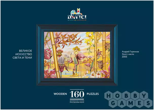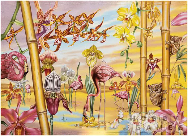 Вам предстоит собрать картину художника Виктора Молева "Великое искусство света и тени". Среди стеблей бамбука и цветущих орхидей спрятались розовые фламинго. Некоторые прямо на виду, а других не отличить от цветов. А в деталях пазла вы найдёте других представителей флоры и фауны – лягушек, лебедей, стрекоз, рыб, крабов и много кого ещё. В этом пазле 33 уникальных фигурки, его по праву можно назвать рекордсменом среди других пазлов компании DaVICI.
