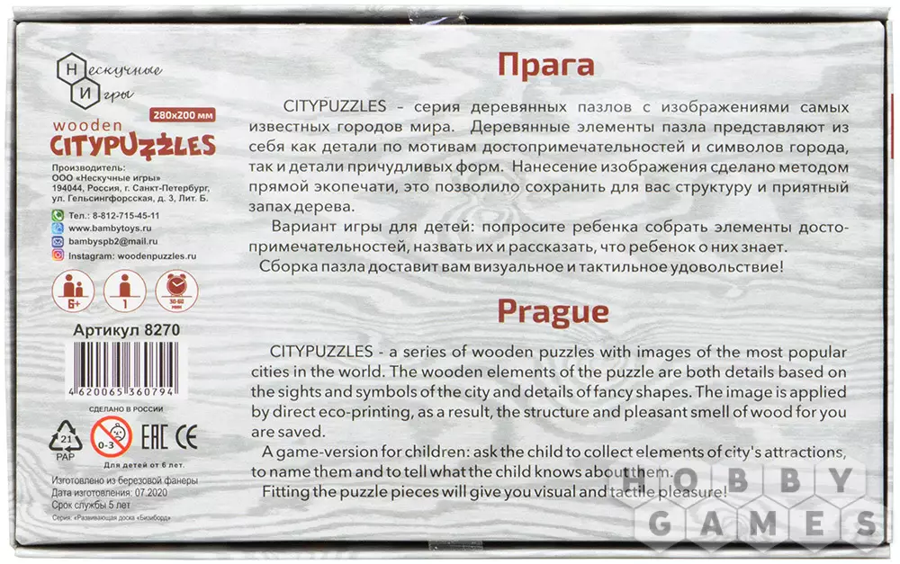 В небольшой коробке из серии Citypuzzles вы найдёте деревянные элементы, складывающиеся в изображение одной из достопримечательностей мира. Это уникальные пазлы, которые сохраняют естественный запах дерева, сделаны методом прямой экопечати. Фигурные детали делают процесс игры интереснее, так как они, несмотря на то, что являются частью целого, становятся самодостаточными элементами, которые любопытно разглядывать по отдельности.