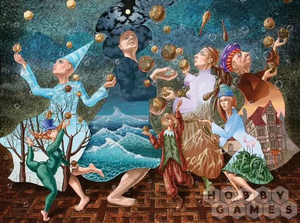 На картине вроде бы все занимаются одним и тем же. Но нужно смотреть внимательнее: дела характеризуют человека, душа - внутренний мир. Пазл изображает сложную совокупность внутреннего мира человека и проявления его личности в жизни.