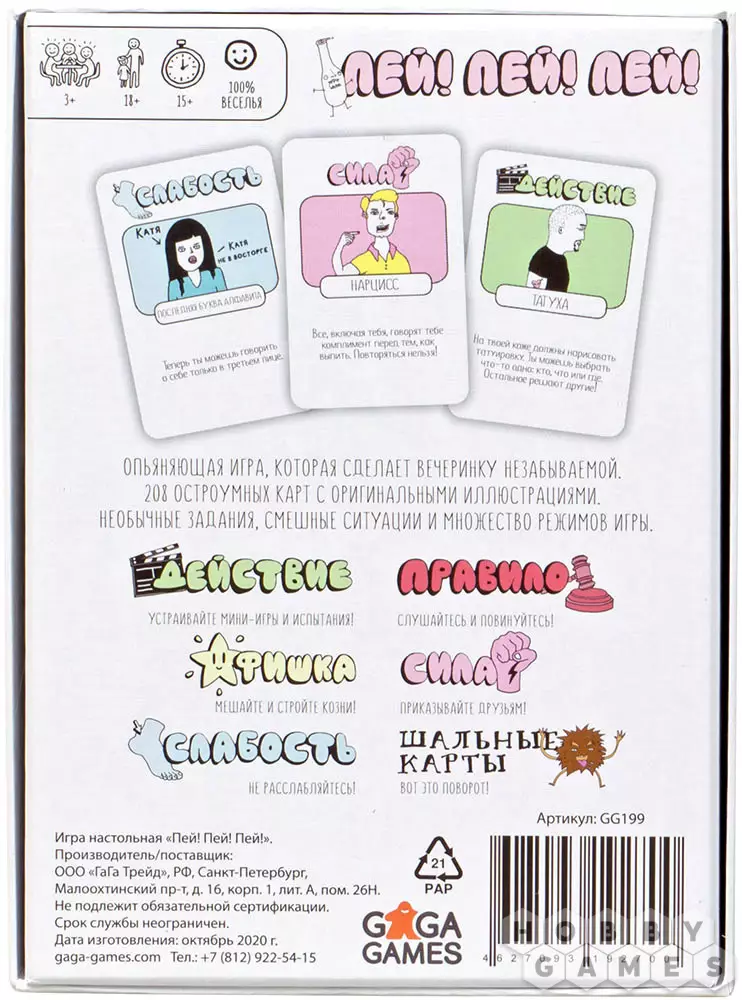 Хотите хорошенько оттянуться? Рецепт такого отдыха очень прост – весёлая компания друзей, крепкая (или не очень, дело вкуса) выпивка и зажигательная настолка, например, "Пей! Пей! Пей!". Две сотни уморительных заданий, побуждающих подвыпивших игроков на отчаянные безумства, сделают ваш пятничный вечер поистине незабываемым (ну или невспоминаемым, если перестараться с горячительными напитками). Градус веселья повышают даже иллюстрации на карточках – похоже, что художник и сам не чужд таким развлечениям, но во время вечеринок ещё и умудряется работать. Правила игры достаточно простые: все по очереди тянут карты из колоды и выполняют написанные на них условия, но это не банальные фанты! Игрокам могут попасться как обычные задания, так и правила, действующие на всех игроков, индивидуальные силы и слабости, которые становятся известны всем, а также фишки, которые можно приберечь на потом. Побеждает тот, кто последний останется трезвым – хотя это как посмотреть, ведь ему, вероятно, придётся вызывать для менее стойких участников такси и убирать за ними поствечериночный беспорядок. А когда базовые правила слегка наскучат – можно попробовать доработанные режимы: командный "Собутыльники", "Ловкачи", проверяющий вашу скорость, или завязанный на удачу и джокеров "Шальные короли". Ну-ка мечи стаканы на стол!