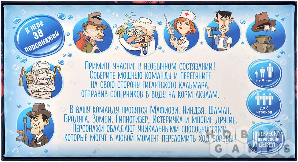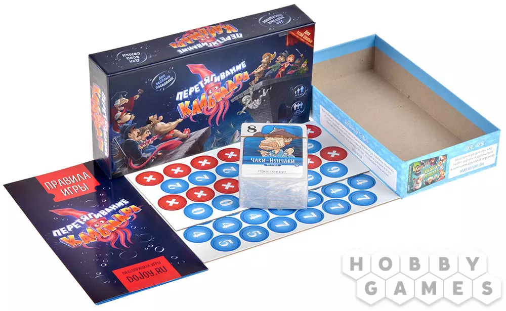 Настольная игра "Перетягивание Кальмара" для 2-6 человек предлагает игрокам выяснить, какая из двух команд круче и сильнее. Проигравшие, увы, отправятся на морское дно.