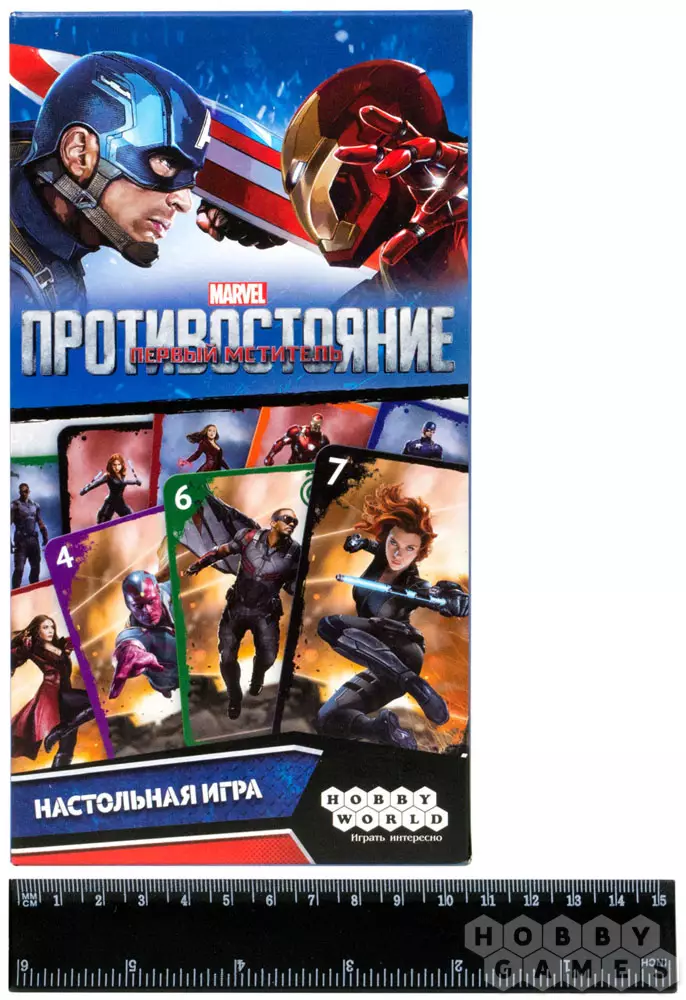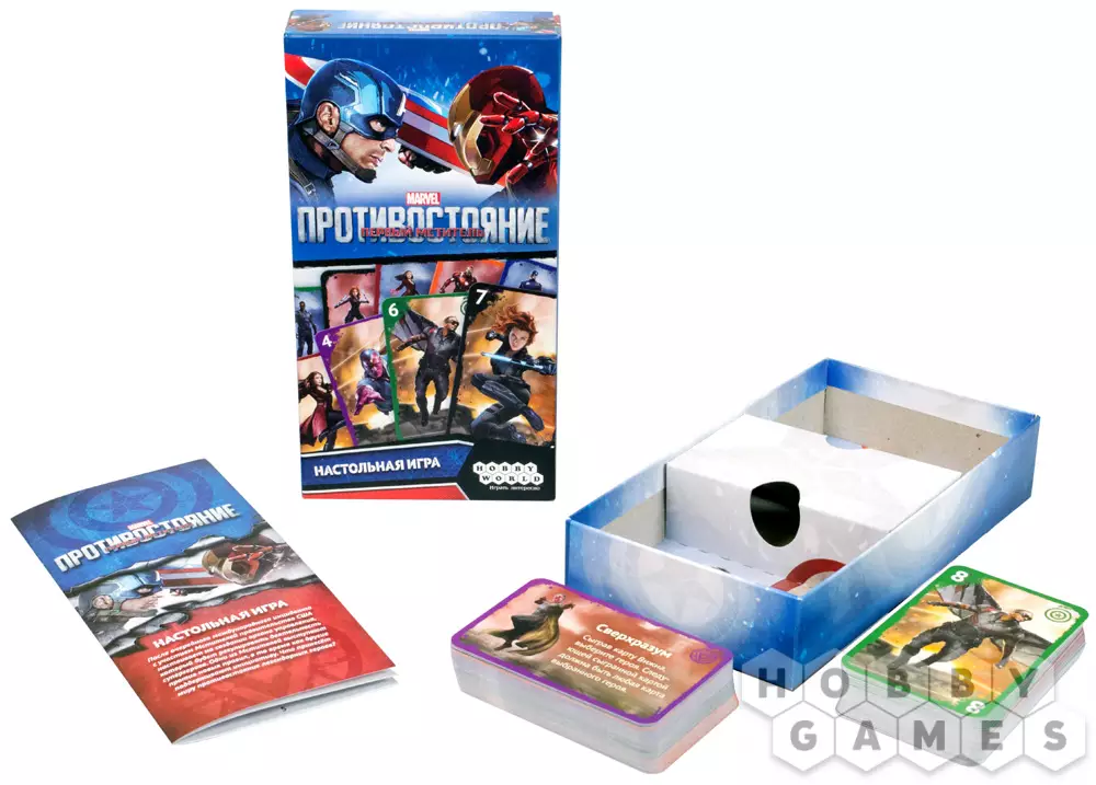 Настольная игра «Первый Мститель. Противостояние» — карточная игра в великолепной вселенной "Марвел". Выяснять отношения между собой будет шестёрка мощнейших персонажей: Капитан Америка, Сокол, Алая Ведьма, Железный Человек, Чёрная Вдова и Вижн. Каждый персонаж обладает несколькими суперспособностями, оказывающими эффект на игровой процесс. По геймплею игра напоминает такой хит, как «Свинтус», дополненную новыми яркими механиками.