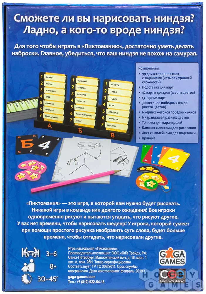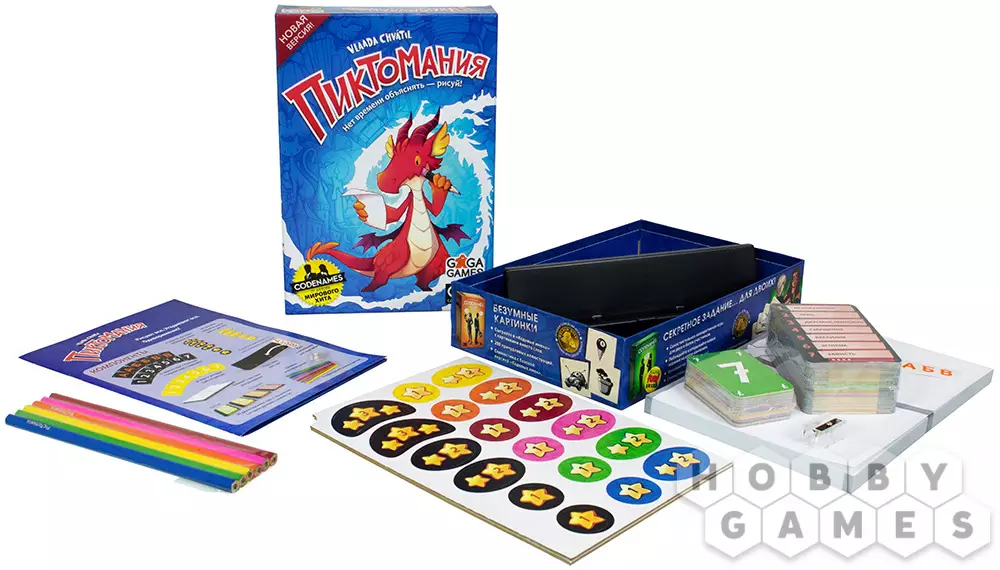 Задания в игре различаются по сложности, причём в карточке могут встретиться слова, похожие друг на друга, например, предметы одежды. Так что с каждым раундом играть будет всё сложнее и интереснее! Ну, а если вы играете с детьми, можно упростить игру, убрав сложные колоды заданий, и сыграть несколько раундов, например, зелёными, самыми простыми картами. Также стоит помнить, что одно и то же слово или выражение можно нарисовать несколькими способами, так что даже если после нескольких партий вам будут попадаться уже ранее нарисованные задания, скорее включайте фантазию и воображение, и игра вам не наскучит!