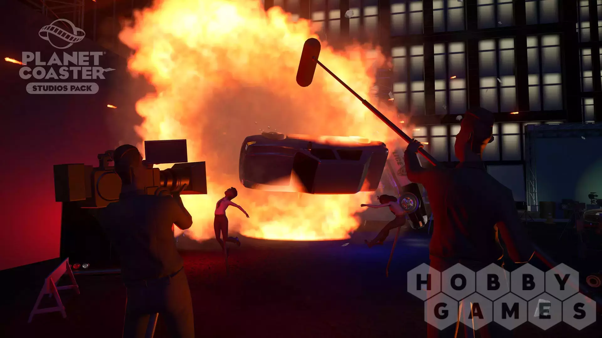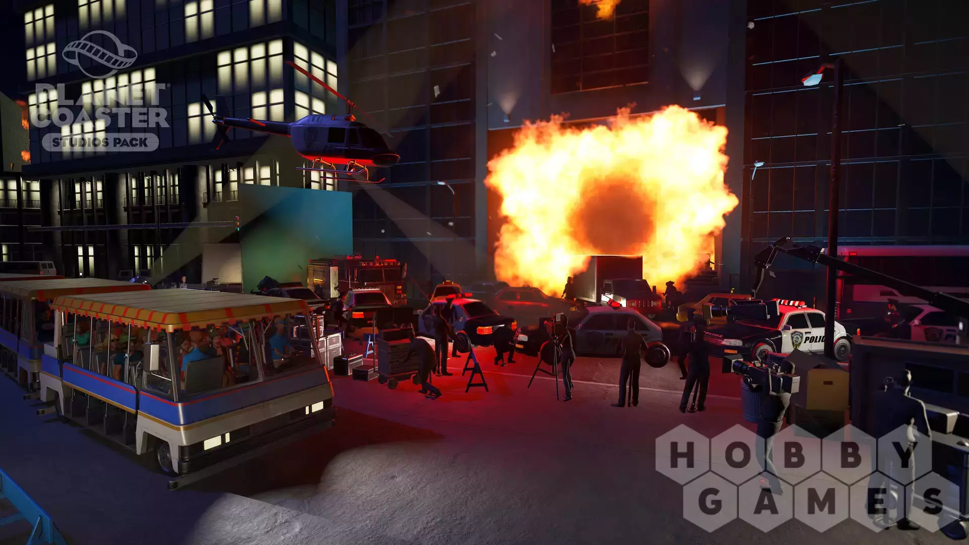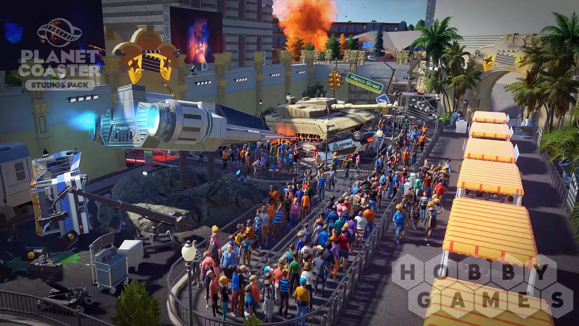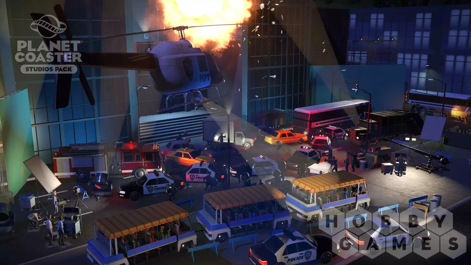 You are the director! Create legendary moments and epic scenes with the new Planet Coaster Studios Pack. Build the ultimate backlot tour and bring the blockbuster experience to life with spectacular stunts, dramatic effects, and rides that put park guests in the heart of the action. Featuring Hollywood props, movie set backdrops and action-packed animatronics, the Studios Pack unlocks an all-new theme park adventure.
