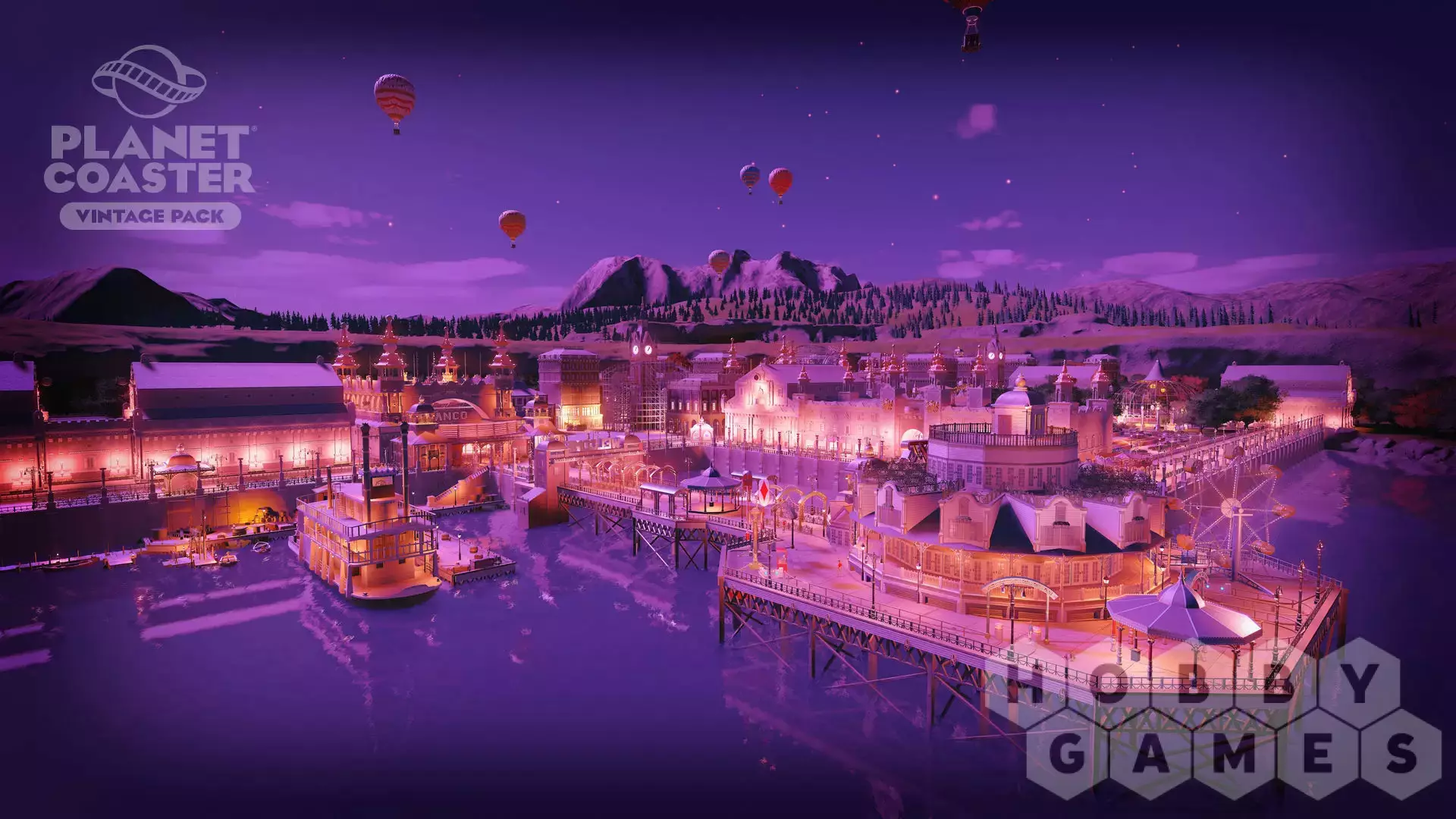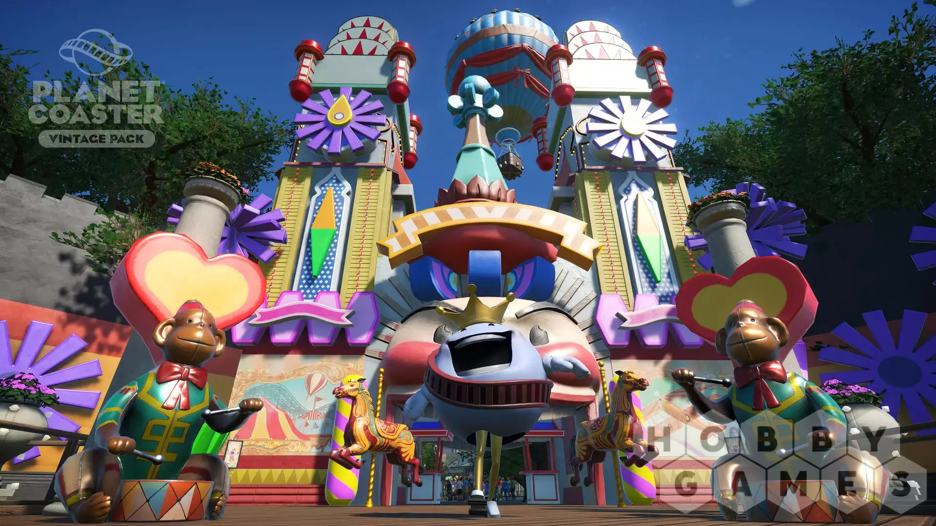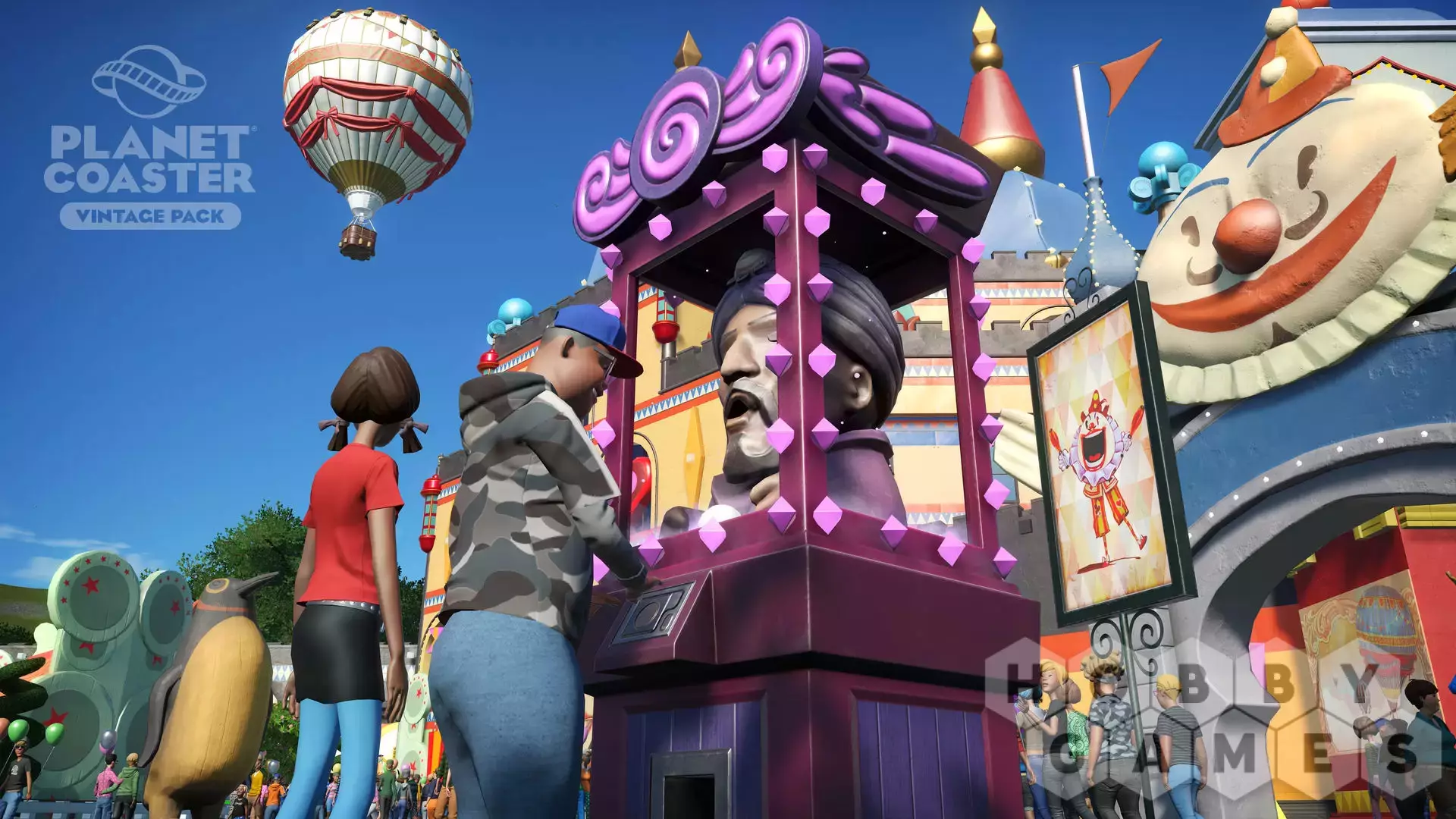 The Vintage Pack includes two new coasters, five new rides, classic roofs and architecture, interactive vending machines, static and animated props, building props, lights and scenery, animated characters, fences, path extras, and character hats.
