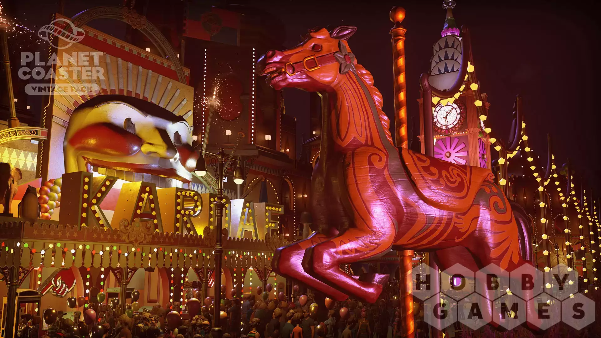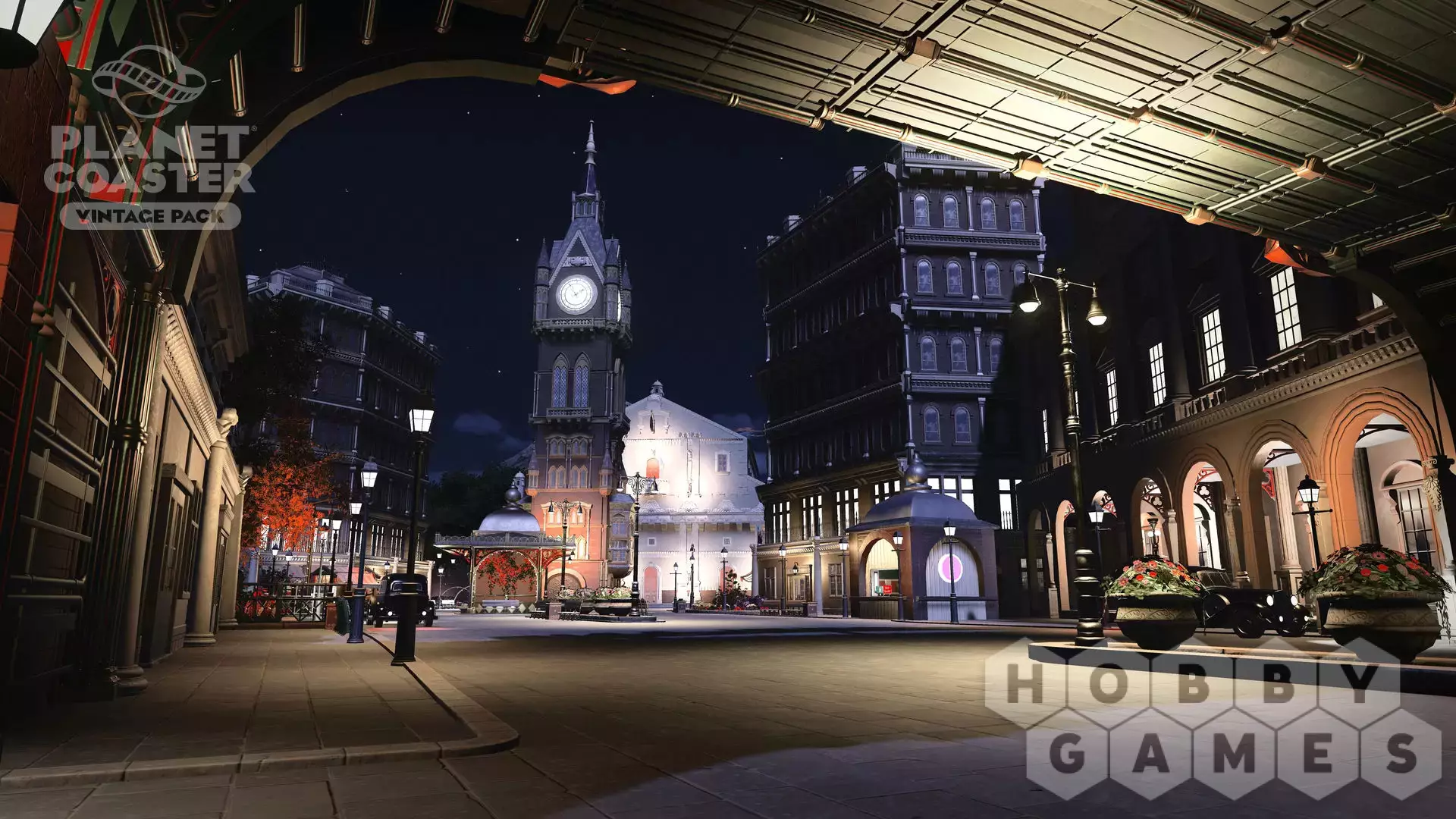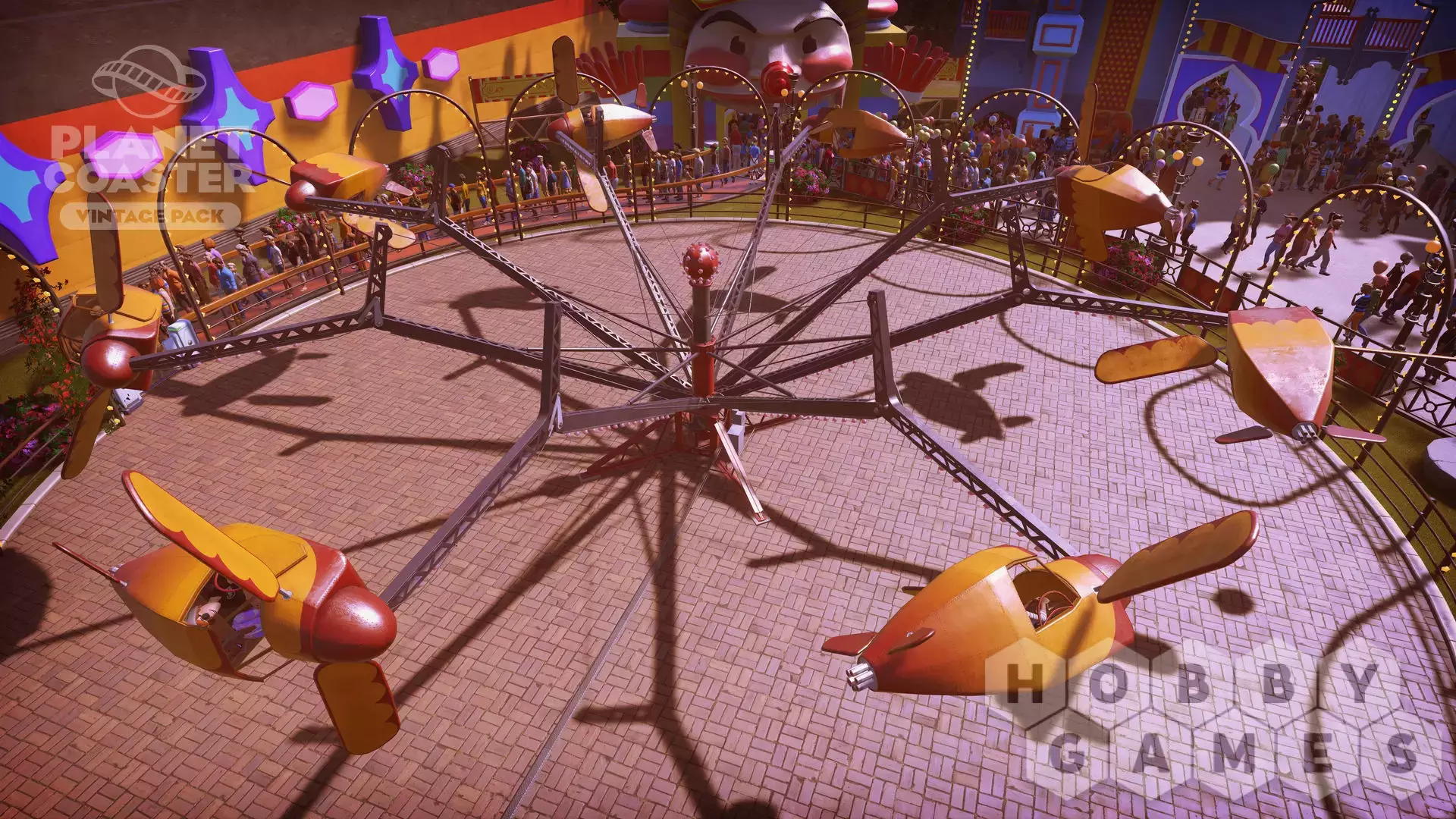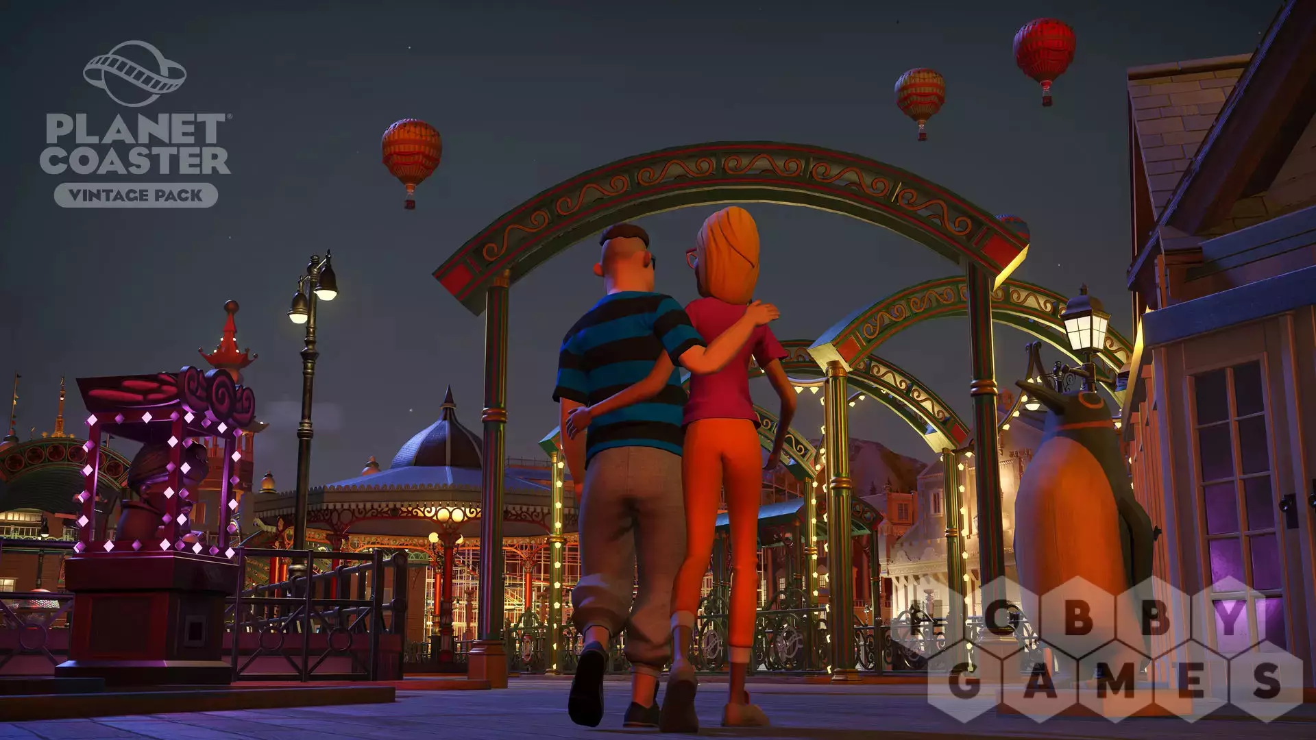 The Vintage Pack includes two new coasters, five new rides, classic roofs and architecture, interactive vending machines, static and animated props, building props, lights and scenery, animated characters, fences, path extras, and character hats.