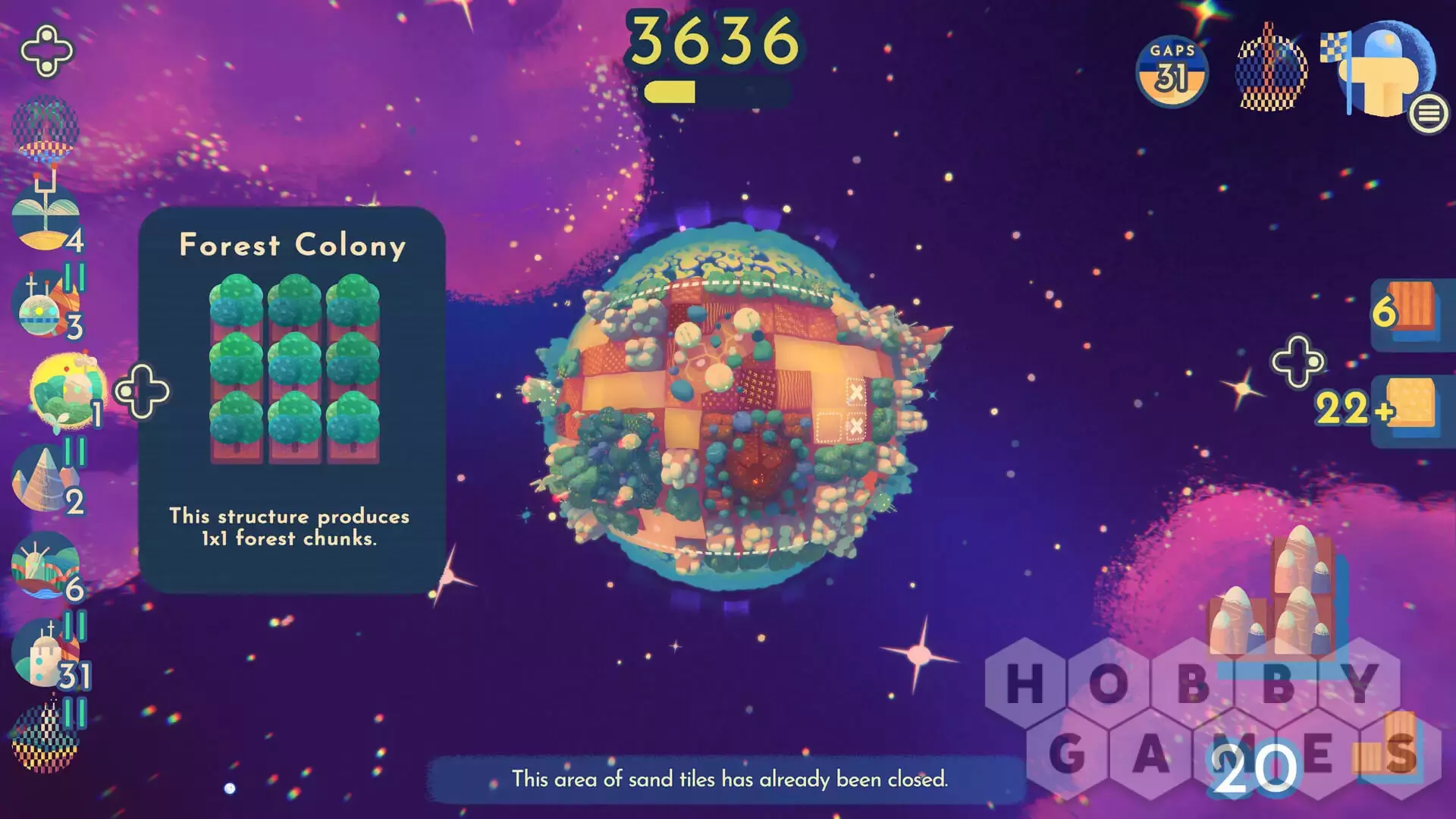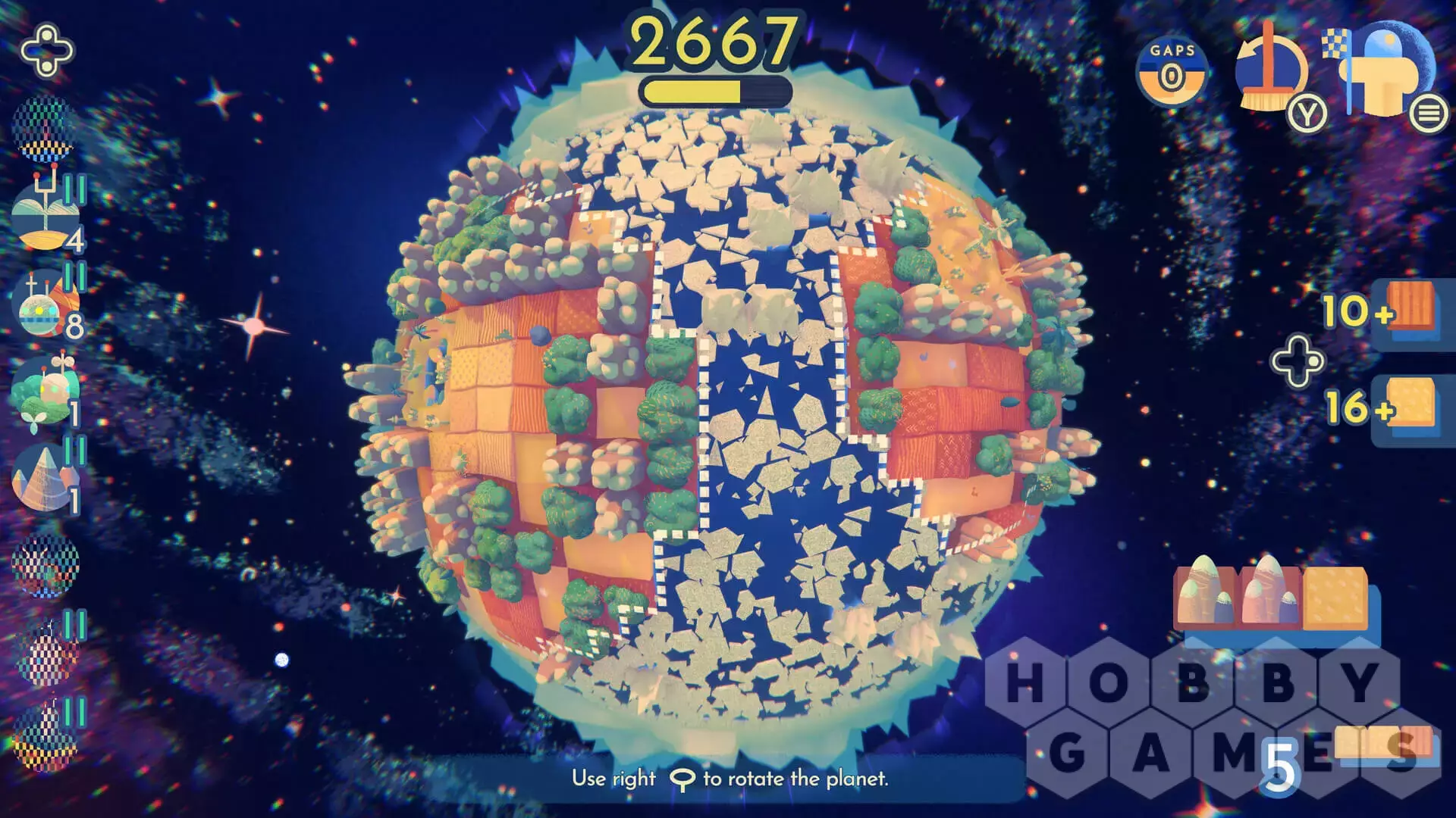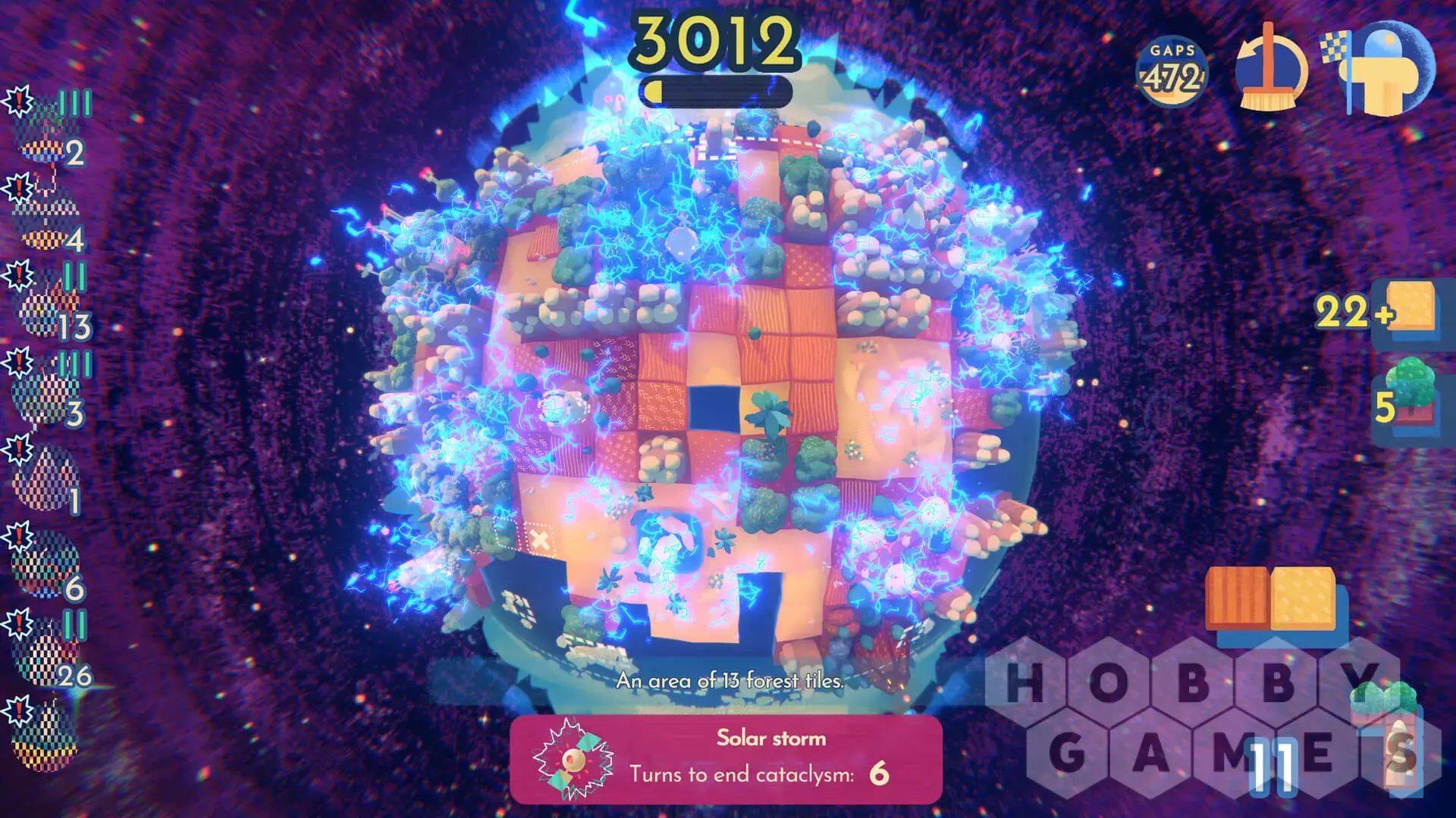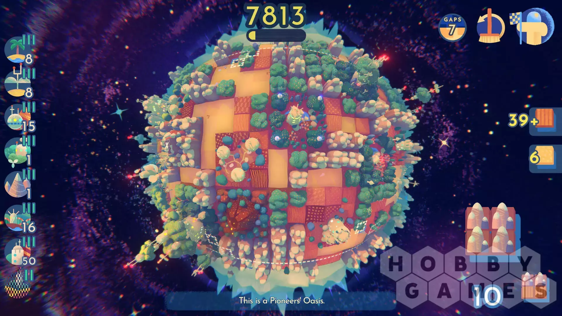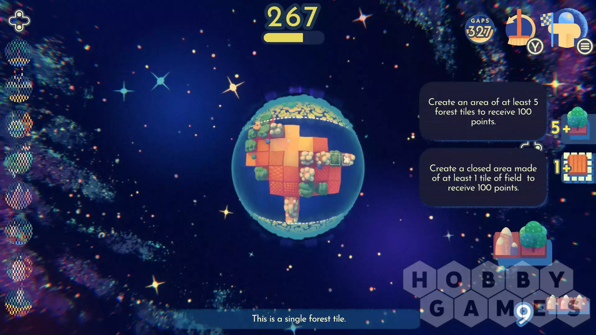 Пейзаж реагирует на ваш выбор. Превратите несколько чахлых деревьев в пышный лес и создайте отдельные биомы, размещая плитки для выполнения квестов и активации бонусов. Три разных размера планет и отсутствие финала означают, что вы можете перемещаться между планетами, создавать биомы и манипулировать ими по своему желанию.
