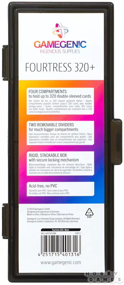 Пластиковая коробочка Fourtress от компании Gamegenic – удобный способ хранить карточки, кубики, жетоны, миплов и другие игровые аксессуары. Этот контейнер сделан из прочного пластика и делится на 4 отсека с помощью съемных перегородок, то есть вы сможете убрать перегородки, чтобы увеличить размер отсеков и уменьшить их количество. Бокс вмещает до 320 карт в двойных протекторах Gamegenic.