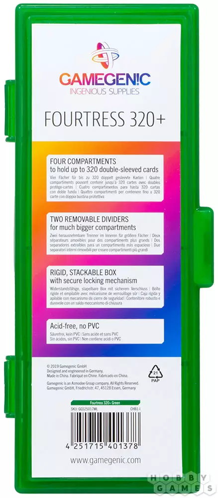 Пластиковая коробочка Fourtress от компании Gamegenic – удобный способ хранить карточки, кубики, жетоны, миплов и другие игровые аксессуары. Этот контейнер сделан из прочного пластика и делится на 4 отсека с помощью съемных перегородок, то есть вы сможете убрать перегородки, чтобы увеличить размер отсеков и уменьшить их количество. Бокс вмещает до 320 карт в двойных протекторах Gamegenic.