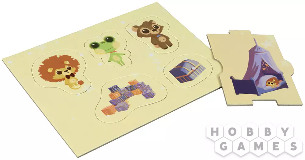 В начале игры в центре стола рубашкой вверх выкладывается случайная карточка, а сверху на неё кладётся жетон-памятка. На стол в открытую размещаются семь карточек, а за ними – ночной жетон, обозначающий конец игры. По краям на столе открываются жетончики плюшевых игрушек и мест комнаты, где могут прятаться зверушки.