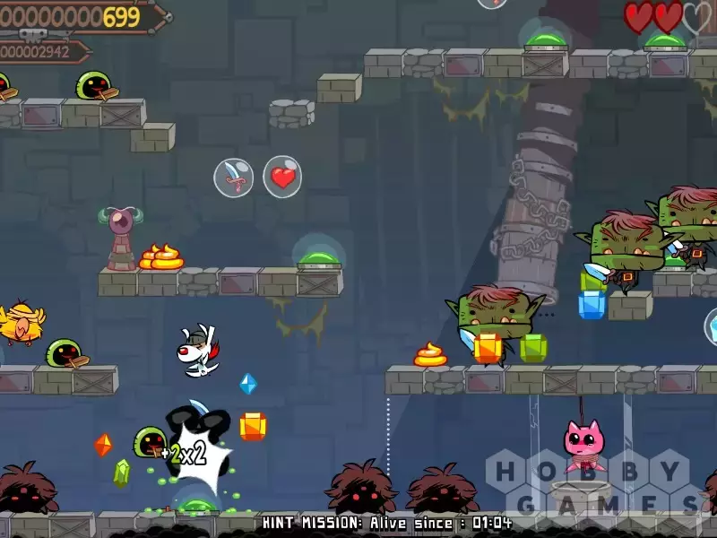 Защищайте котенка от похитителей всеми силами! Прыгайте на них сверху, жгите, замораживайте, колите, взрывайте... Мы же говорили, что Poöf пойдет на все, чтобы спасти столь ценного кота. Кроме того, вы сможете управлять временем и замедлять его в особо опасные моменты. Готовы к сражению? Захватчики уже совсем близко!