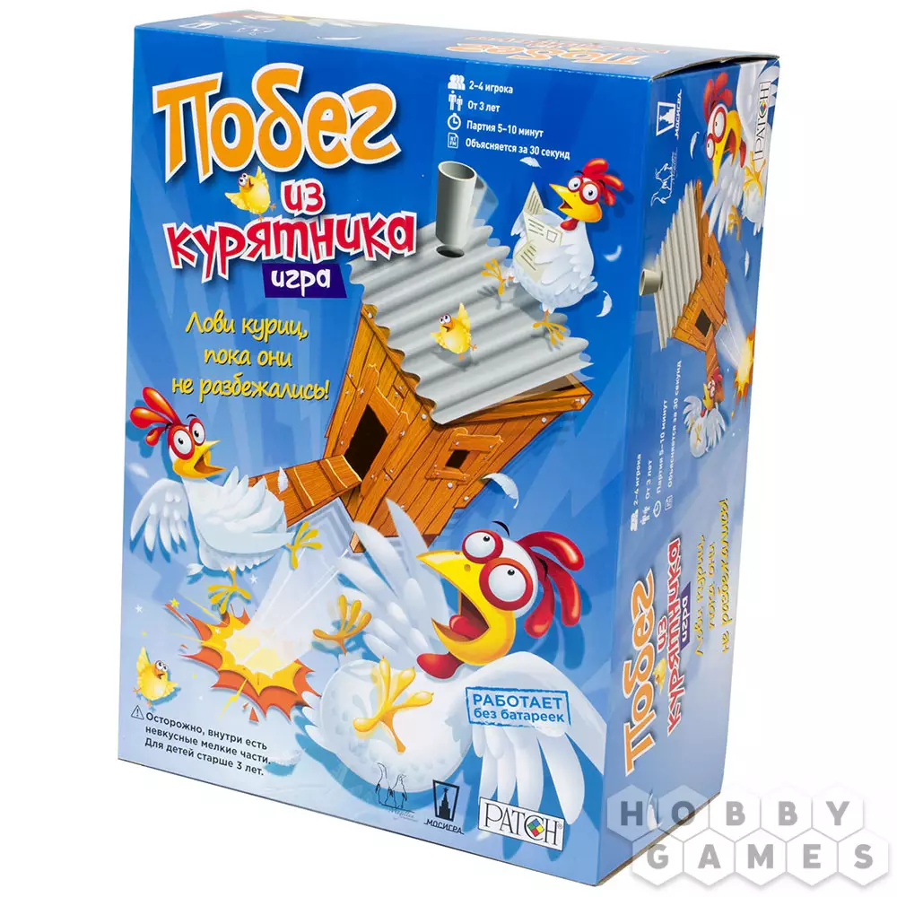 Ловите курочек, а то они разбегутся в разные стороны! "Побег из курятника" – это безумная настольная игра, в процессе которой вам нужно избавиться от всех ваших куриц, пока они не сбежали. Невероятный прыгающий куриный домик станет эпицентром веселья, а тридцать шесть куриц будут из него убегать.