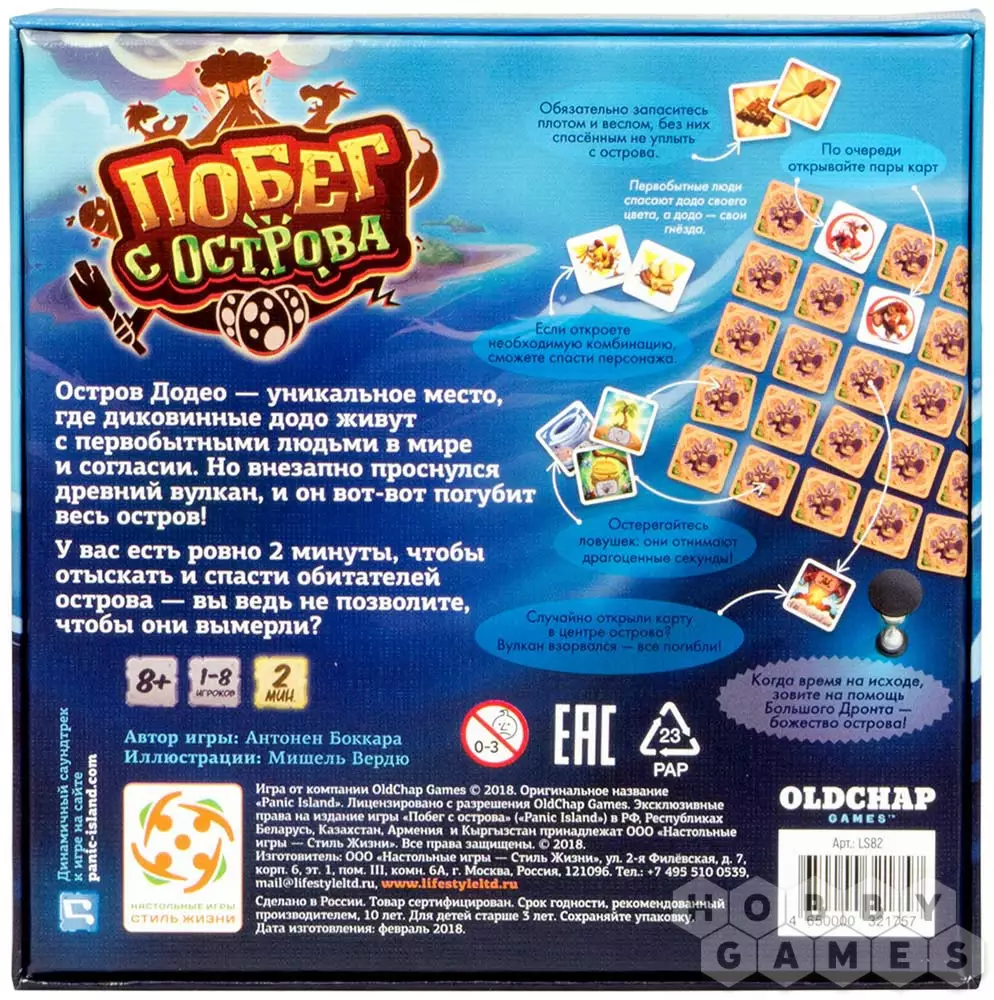 Для начала игры сформируйте остров в виде квадрата из карточек размером 5х5. Обычно вулкан кладётся в центре карты, но для усложнения игры, можно положить его в другое месте. В свой ход игроки могут просмотреть любые две карточки. Если среди карт не окажется ловушек и обе карты одинакового цвета, то возможно кто-то сможет спастись! Всё зависит от комбинаций: человек может спасти додо, а додо может спасти яйцо. Спасённая карточка откладывается отдельно, а спасатель возвращается на игровое поле взакрытую. И не забывайте, для того чтобы покинуть остров, ещё понадобится найти лодку и вёсла, иначе с острова не уплыть!