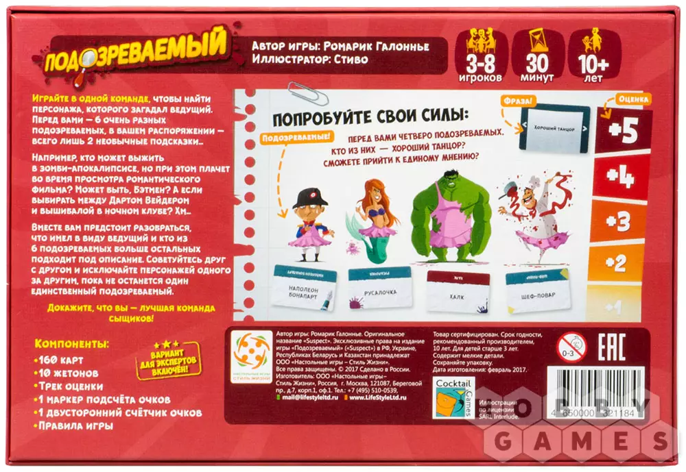 Вместе вам предстоит разобраться, что имел в виду ведущий и кто из 6 подозреваемых больше остальных подходит под описание. Советуйтесь друг с другом и исключайте персонажей одного за другим, пока не останется один единственный подозреваемый.
