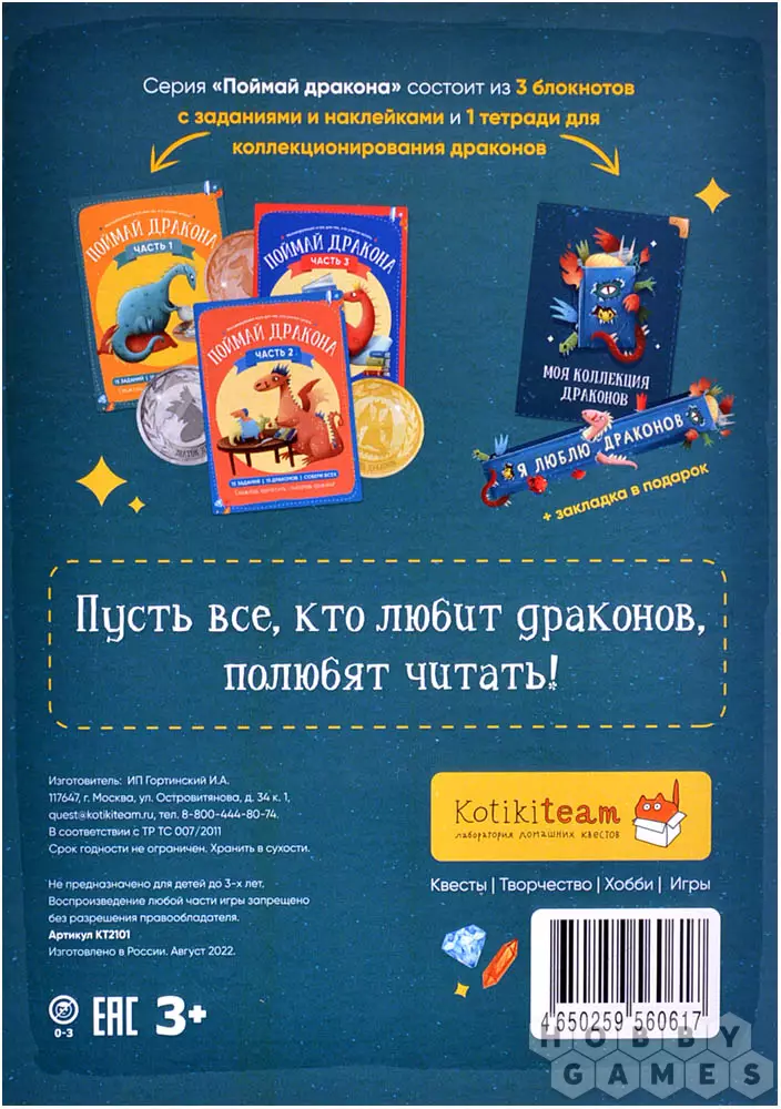 "Поймай дракона" – это серия детских обучающих квестов, которые замотивирует ребёнка читать и привьют ему любовь к этому делу в простой игровой форме. В каждом блокноте серии "живут" 15 драконов, каждый из них уникальный и любит что-то своё. Спрячьте наклейки драконов в разные места, и скажите ребёнку, что у вас дома водятся настоящие дракона! Чтобы их найти, ему понадобится самостоятельно прочитать, что любит каждый дракон и постараться найти их всех.