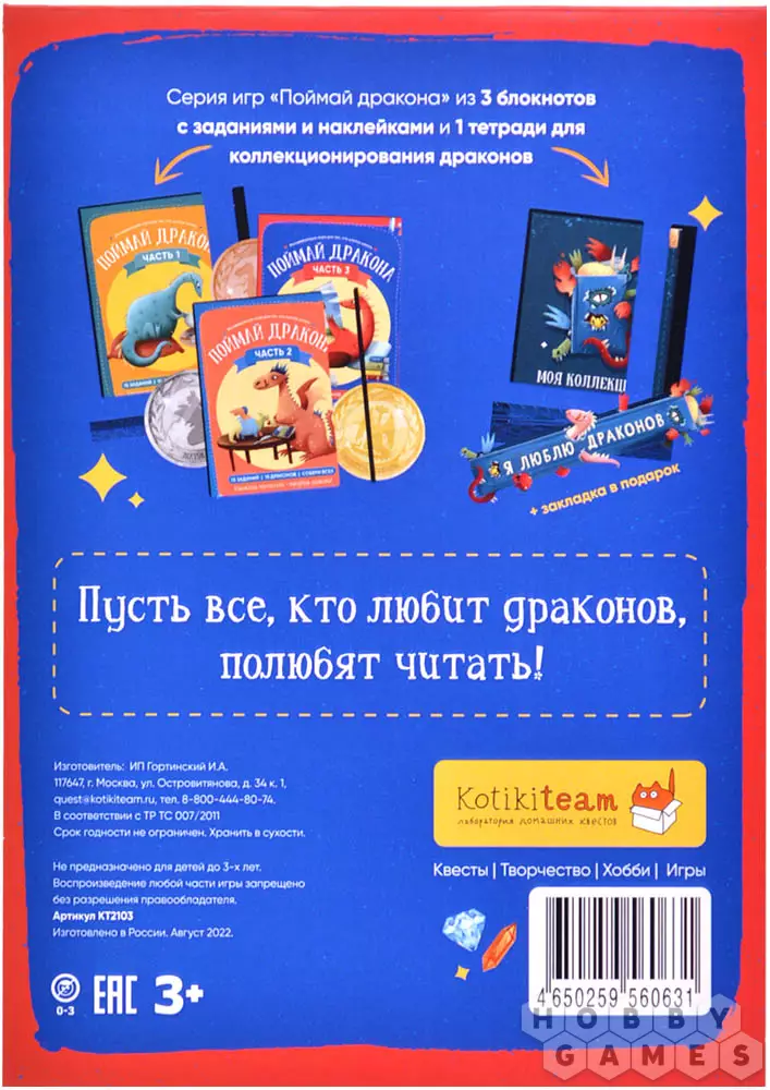 "Поймай дракона" – это серия детских обучающих квестов, которые замотивирует ребёнка читать и привьют ему любовь к этому делу в простой игровой форме. В каждом блокноте серии "живут" 15 драконов, каждый из них уникальный и любит что-то своё. Спрячьте наклейки драконов в разные места, и скажите ребёнку, что у вас дома водятся настоящие дракона! Чтобы их найти, ему понадобится самостоятельно прочитать, что любит каждый дракон и постараться найти их всех.