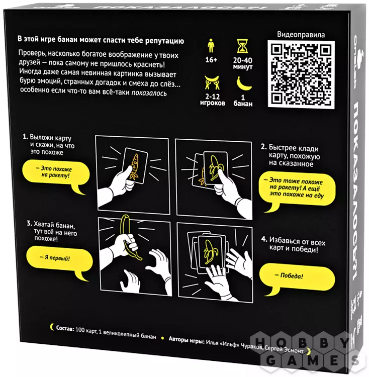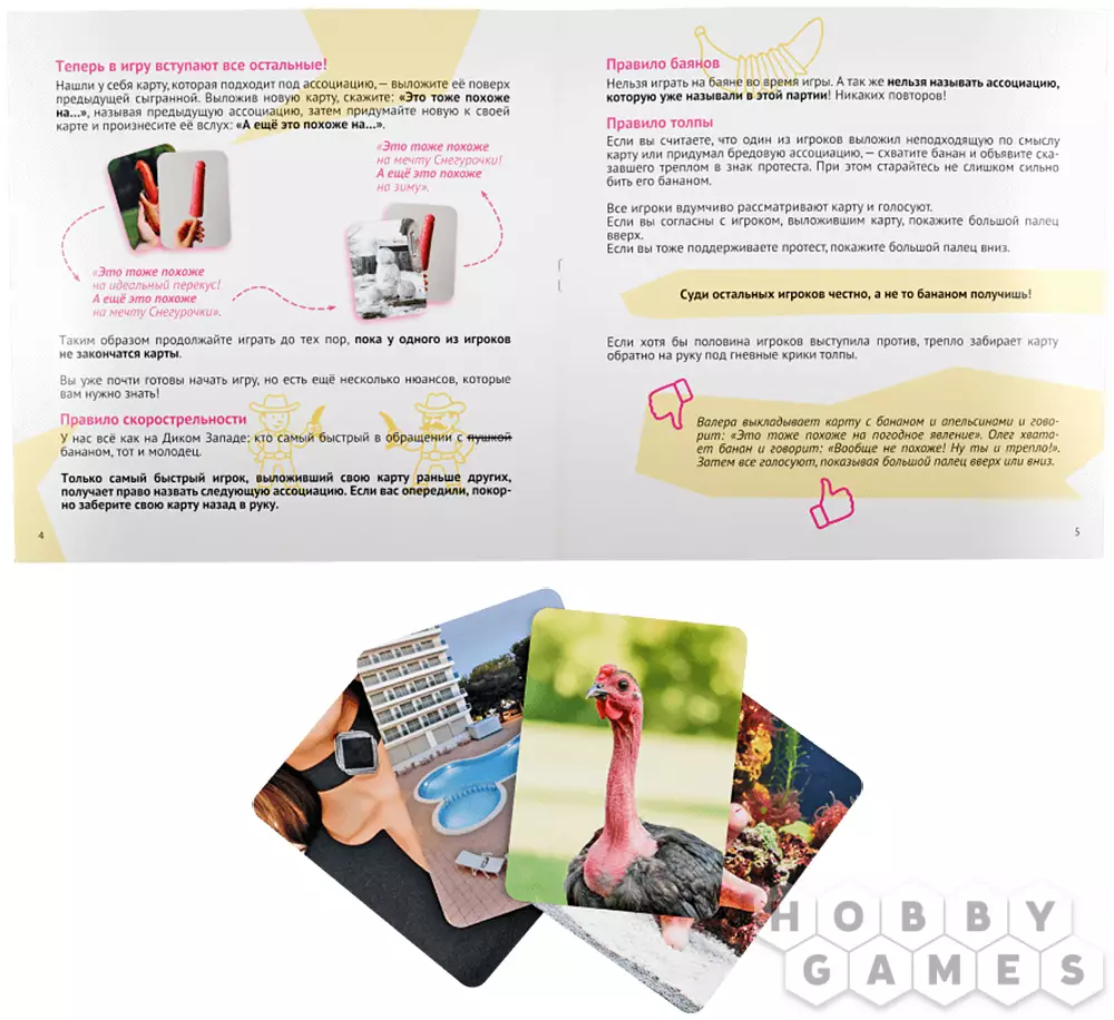 "Показалось?!" – это весёлая карточная настолка для компаний постарше, настоящий аттракцион абсурдных ассоциаций, где невинное изображение может обернуться самым неожиданным намёком. Ваша главная задача – первым избавиться от всех своих карт. Но просто скинуть их не получится: каждую карту нужно "обосновать" – озвучить смешную, неожиданную или откровенно абсурдную ассоциацию. Здесь нет правильных ответов, но будьте готовы – каждый из участников оставляет за собой право усомниться в том, что ваша реплика действительно подходит той или иной карте. Все протесты выражаются с помощью банана – главного арбитра игры, "активация" которого переводит игровой процесс в голосование, решающее судьбу спорной ассоциации. А ещё в "Показалось?!" есть особые карты-джокеры, которые могут могут перевернуть ход игры с ног на голову – например, заставить всех игроков обменяться своими картами.