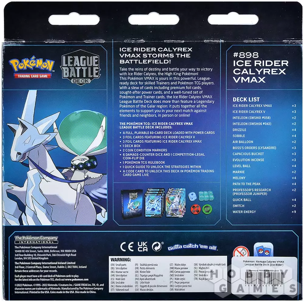Вершите свою судьбу вместе с Ice Rider Calyrex – поражающим воображение королём покемонов, слившимся с ледяным Glastrier и породившим таким образом союз невероятной силы! В этой колоде собрались мощные покемоны водного типа, идеально подходящие для как для опытных тренеров, которые готовы покорять непокорённые прежде вершины и выходить на новые уровни, так и для только начинающих игроков. Ice Rider Calyrex VMAX League Battle Deck содержит в себе всё необходимое для того, чтобы окунуться с головой в мир битв и выступить против желающих помериться силами. Внутри вы найдёте 60 обычных карт, а также несколько премиальных, монетки-маркеры, кубики и другое – вам не придётся тратить драгоценное время на дополнительную подготовку к сражению! Используйте максимум доступных вам способностей и побеждайте!