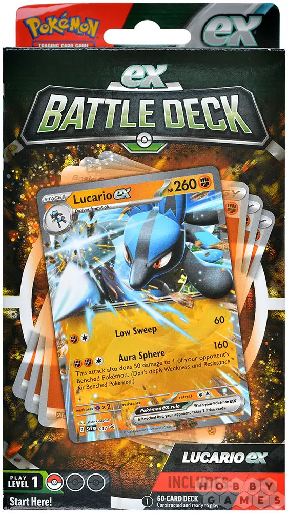 В этой колоде собралась целая команда мощных покемонов боевого и обычного типов. Возглавляет их Lucario ex, взгляду которого подвластны чужие ауры. Это знание делает Lucario ex искусным бойцом, ведь оно позволяет считывать эмоции и намерения соперника, а также управлять энергетическими волнами и наносить огромный урон. В колоде содержится 60 карт и ряд аксессуаров, которые позволят вам сразу окунуться в мир сражений сразу, не теряя ни одной лишней секунды на дополнительную подготовку. Так, внутри Lucario ex Battle Deck вы найдёте счётчики урона, игровой коврик, металлическую монету и другое. Атакуйте соперников энергией и побеждайте!
