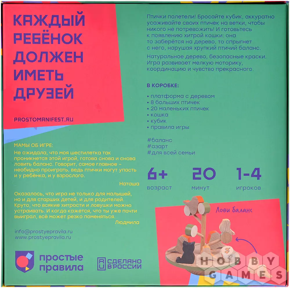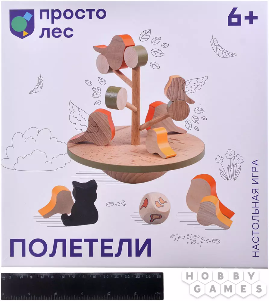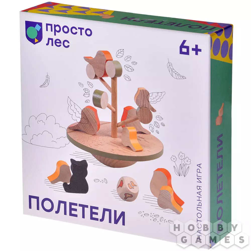 Игра "Полетели" проверит вашу моторику и ловкость! Каждый ход вам предстоит ставить на шатающуюся платформу с деревом фигурки птичек. В начале своего хода игрок кидает кубик, чтобы определить, какую именно фигурку ему нужно поставить – большую или маленькую, и в каком количестве. На кубике также есть особая сторона – если она выпадает, игрок должен поставить на платформу фигурку кошки или убрать её, если эта фигурка уже на платформе.