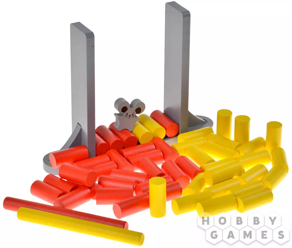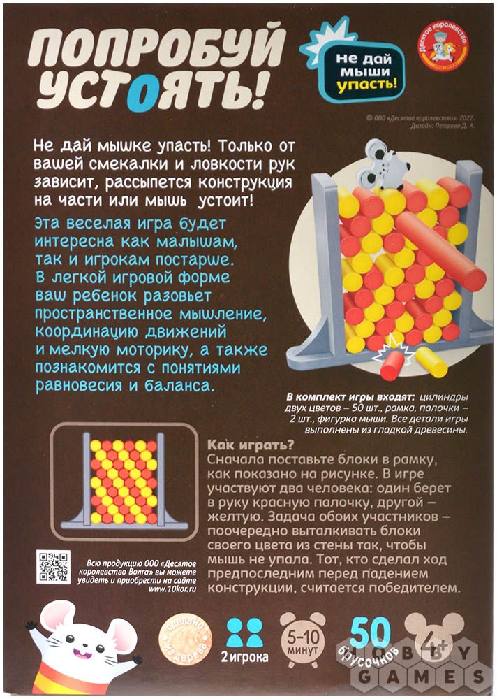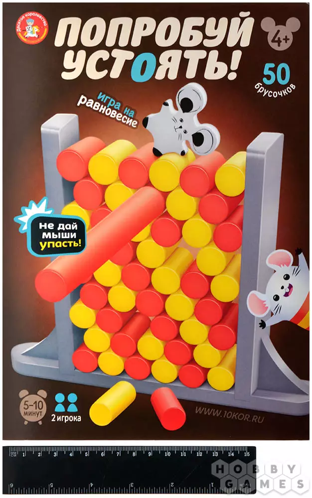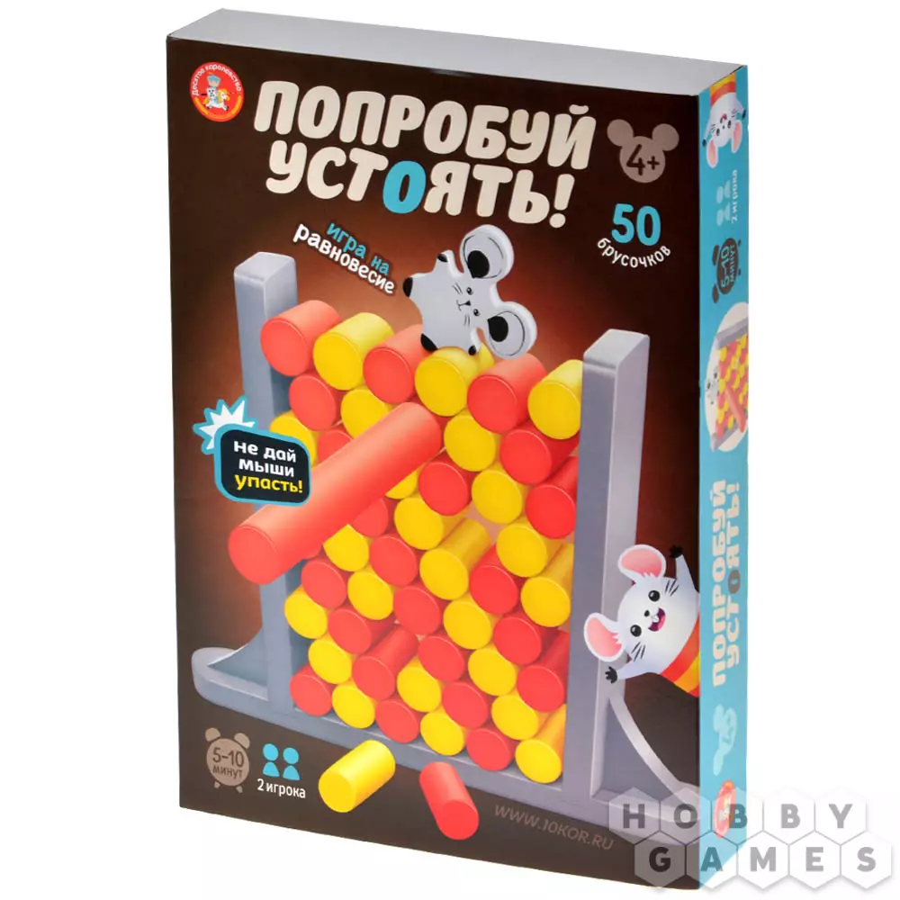 "Попробуй устоять!" – это весёлая детская настольная игра на ловкость. Игроки по очереди выталкивают из конструкции цилиндры своего цвета, стараясь не допустить падения мышки с самого верха. Тот, кто развалит конструкцию, проигрывает, а победителем считается игрок, делавший ход перед ним.