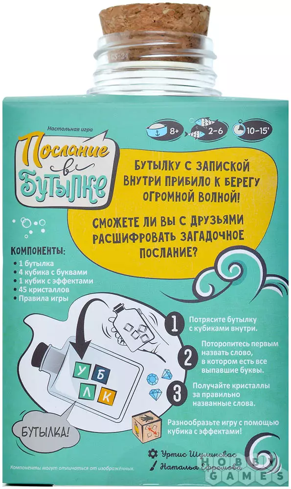 "Послание в бутылке" – это прекрасная игра на эрудицию, отлично подходящая для компаний, желающих проверить свой интеллект. Правила безумно просты: трясите бутылку с кубиками и придумывайте слова, в которых будут содержаться все выпавшие буквы. Удалось? Берите победный кристалл! Совершили ошибку? Увы, с одним из накопленных кристаллов придётся распрощаться. А чтобы было ещё веселее, пробуйте разные режимы игры – благо, их предусмотрено достаточно! Ваша цель – набрать 8 кристаллов и стать мастером эрудиции!