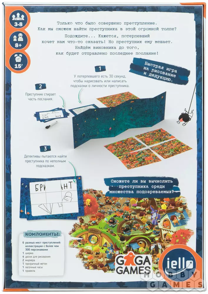 Итак, в игре присутствуют детективы, преступник и пострадавший. Последние сидят на противоположной стороне от детективов и закрываются ширмой. Перед ними лежит картинка со множеством героев, на которой преступник прозрачной фишкой отмечает одного из них – он и совершил преступление. Его личность и расположение на картинке для детективов остаётся загадкой. Потерпевший не может ничего рассказать, поэтому за 30 секунд на планшете он должен написать и/или нарисовать подсказки, которые помогут детективам отыскать загаданного персонажа на своих картинках (да, у детективов есть свои). Планшет поделён на 9 секторов, в каждом из которых можно разместить отдельную подсказку. По истечении времени, преступник забирает планшет у потерпевшего и стирает 5 подсказок, после чего передаёт его детективам. Преступник таким образом может запутывать сыщиков, оставляя только неоднозначные подсказки. Партия длится 4 раунда. В каждом следующем преступник стирает на одну подсказку меньше, так что у детективов появляется больше шансов разгадать его личность. Если в конце любого из раунда детективы раскрывают преступника, то они вместе с потерпевшим выигрывают. А если в конце четвёртого раунда детективы не смогли определить местоположение преступника, то злоумышленник остаётся безнаказанным и побеждает в игре.