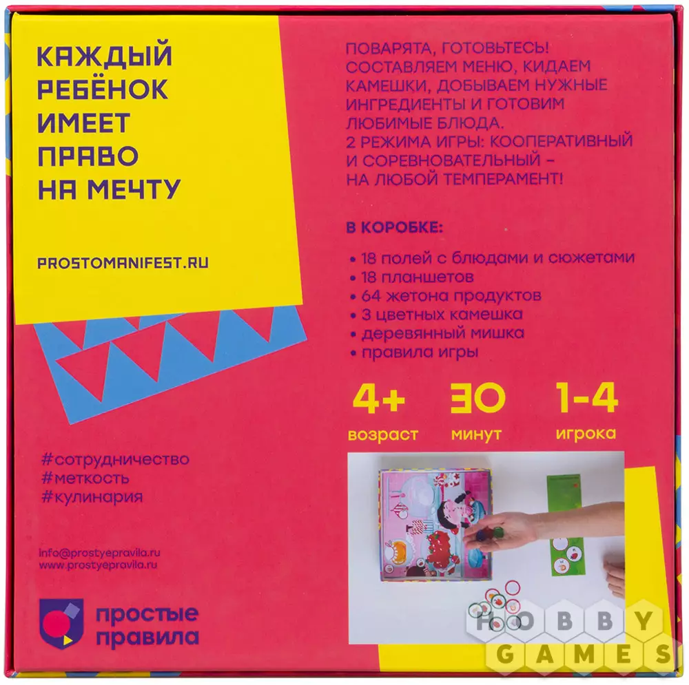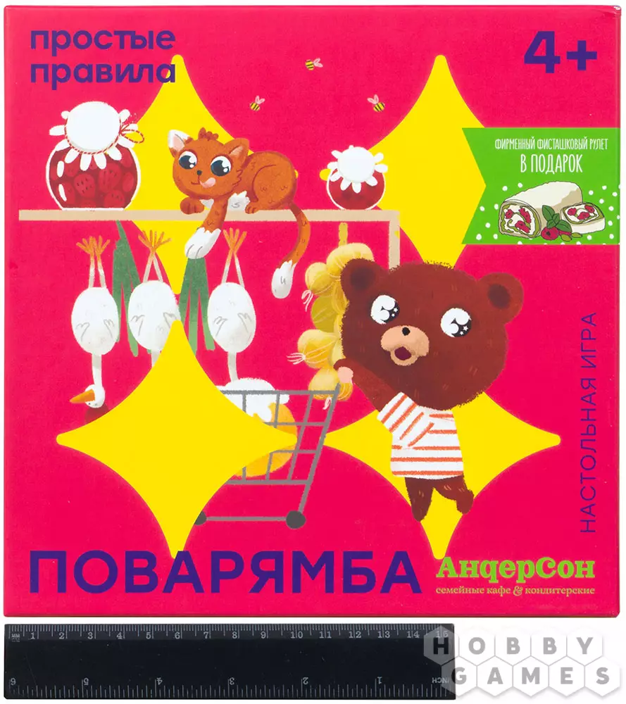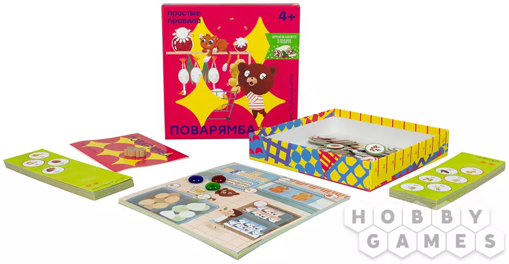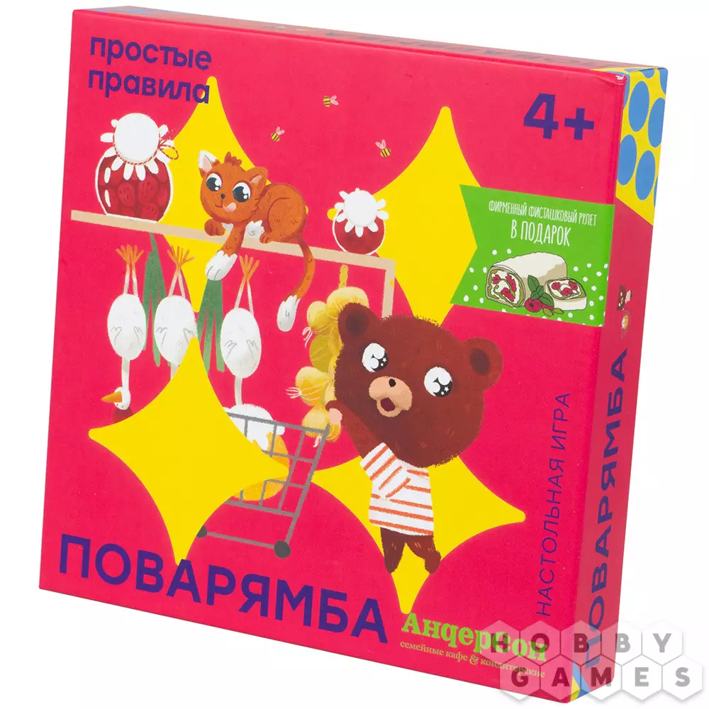 Если ваш ребёнок проявляет интерес к кулинарии и любит помогать вам на кухне, то эта игра точно его заинтересует! "Поварямба" – это настольная кооперативная игра. Все игроки преследуют общую цель – сообща успеть за 14 ходов приготовить как можно больше блюд. Медвежонок Густав будет не только вести отсчёт ходов, но и помогать вам в поиске нужных ингредиентов для блюд, которые вы готовите.