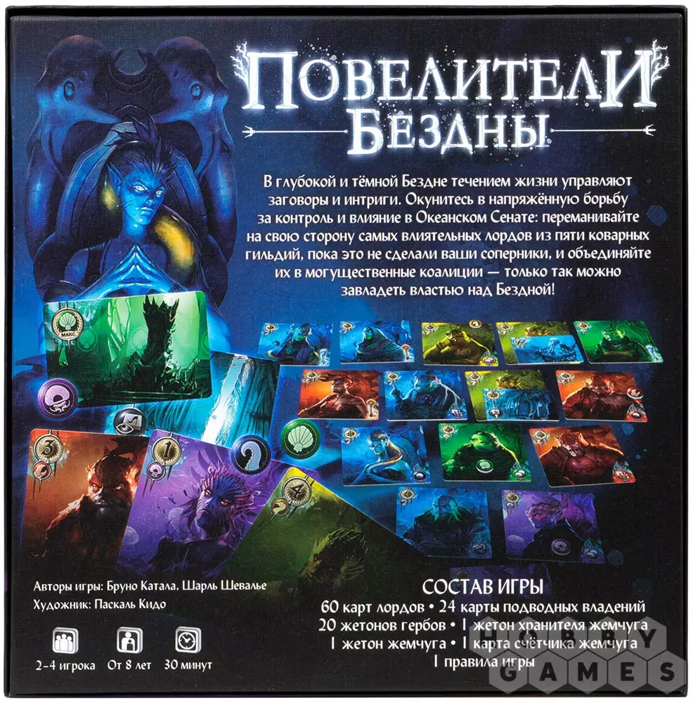 Настольная игра "Повелители Бездны" сочетает в себе популярную механику карточных настольных игр и стратегические элементы, за счёт чего достигается баланс динамики и пошагового планирования путей достижения победы. Загадочный и привлекательный антураж игры создают задействованные в ней лорды пяти подводных рас: Политики (герб с осьминогом), Торговцы (герб с ракушкой), Земледельцы (герб с морским коньком), Воины (герб с клешней краба) и Маги (герб с наутилусом). Привлекайте их в свою коалицию, собрав наиболее влиятельный альянс и захватив контроль над Океанским Сенатом. Влиятельность вашего альянса будет определена суммарным количеством очков влияния, заработанных в ходе игры.