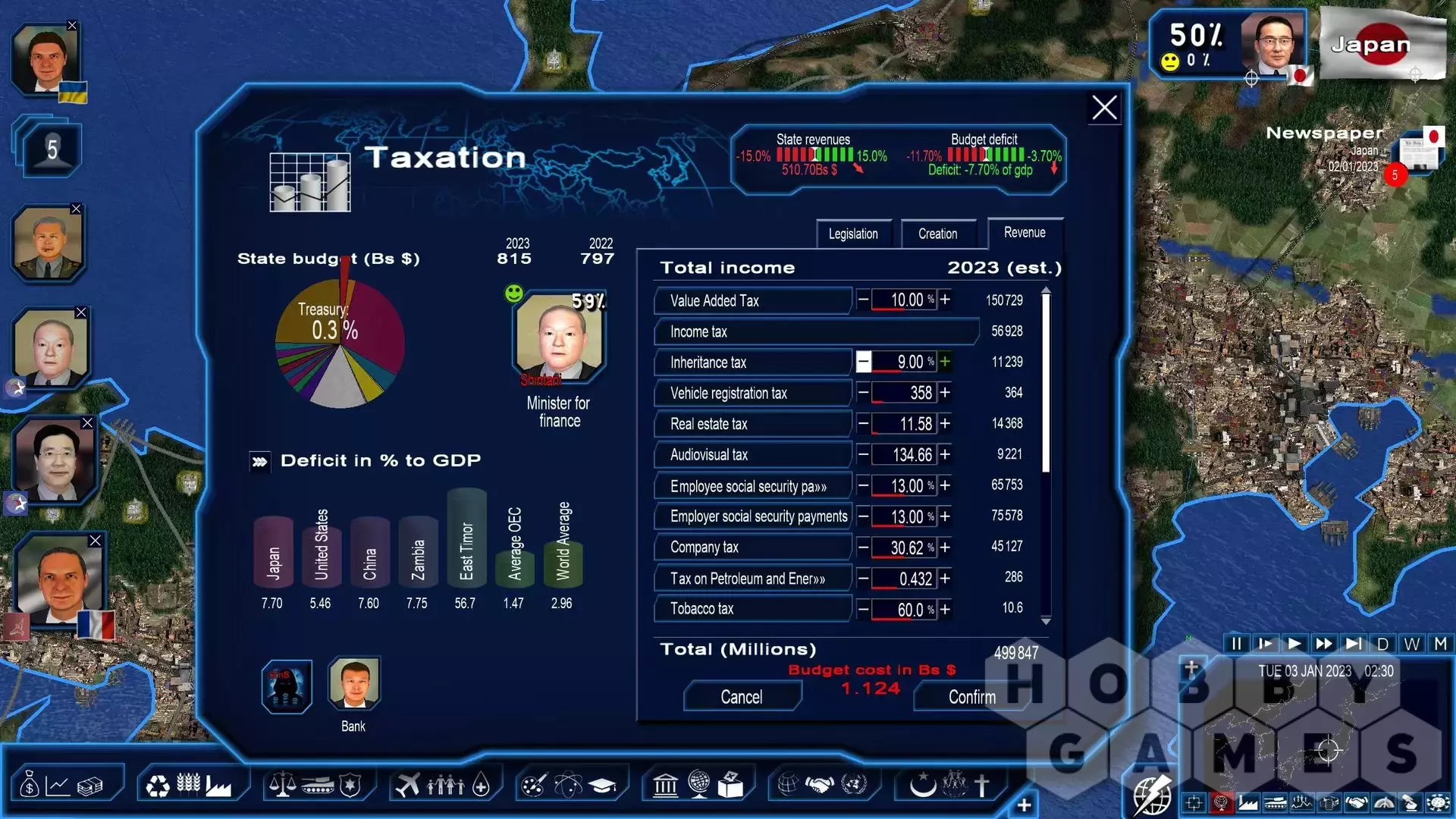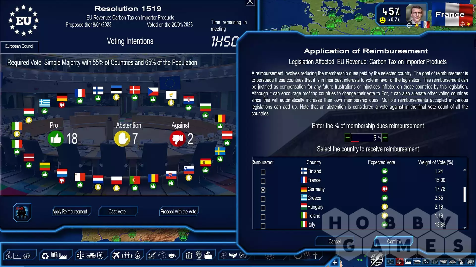 - various societal laws such as surrogacy, the status of transgendered persons, the level of smoking restrictions in public spaces, regulation of religious garb, the fight against unreported employment and modern slavery… and many other additions such as the interest rates of the European Central Bank, fixing severance pay, the option of realistic construction times, the Australian Senate, mega wind and solar farms, a scenario to establish over 100 democracies in the world, various improvements to the God’n’Spy mod (joining an organization, accelerated production of military equipment, details on the combativeness of soldiers)...