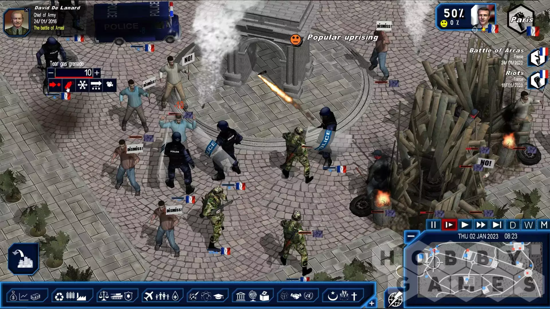 For an even more detailed simulation of this conflict, several wargame features have been added: digging trenches, building "dragon's teeth" type barriers or bunkers, incorporating artillery by the use of mortar rounds, laying down minefields, simulating troop morale which influences combat effectiveness and the risk of desertions, the possibility of moving troops stealthily, the use of suicide drones, partial mobilization, budgeting for the training and equipping of infantrymen, hiring a private paramilitary group, high velocity missiles, creation of an international military base, etc.
