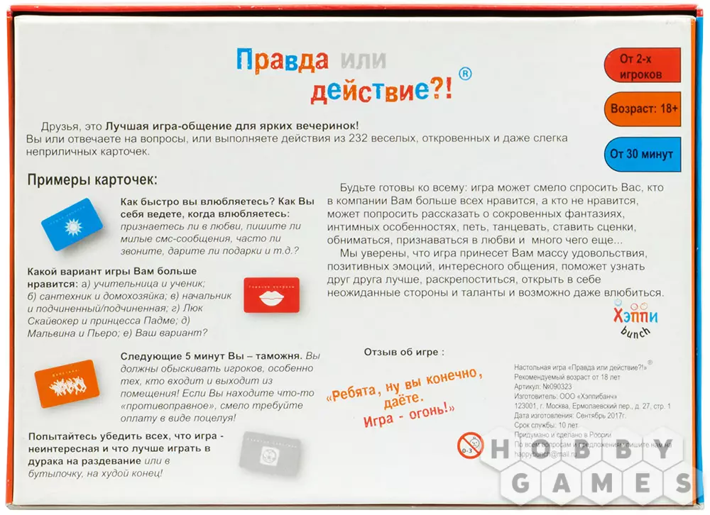 Игра состоит из ярких, веселых, провокационных, откровенных и порой откровенно-неприличных вопросов и заданий! Вы вытягиваете карточку и окунаетесь в водоворот эмоций, опасностей, интриг, веселья и хорошего настроения!