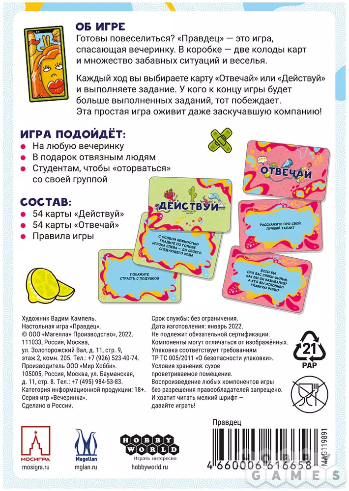 Правила вечериночной настолки "Правдец" крайне просты – каждый игрок в свой ход выбирает одну из колод, берёт карту, после чего, прочитав задание, выполняет его. Если всё получилось, закидывайте в копилочку одно победное очко и передайте ход дальше. Ну а если с выполнением задания возникли какие-то трудности, в виде штрафа (ну а кому-то, может быть, и наоборот) придётся махнуть рюмашку, или иными словами, выпить (напоминаем о вреде чрезмерного употребления горячительных напитков).