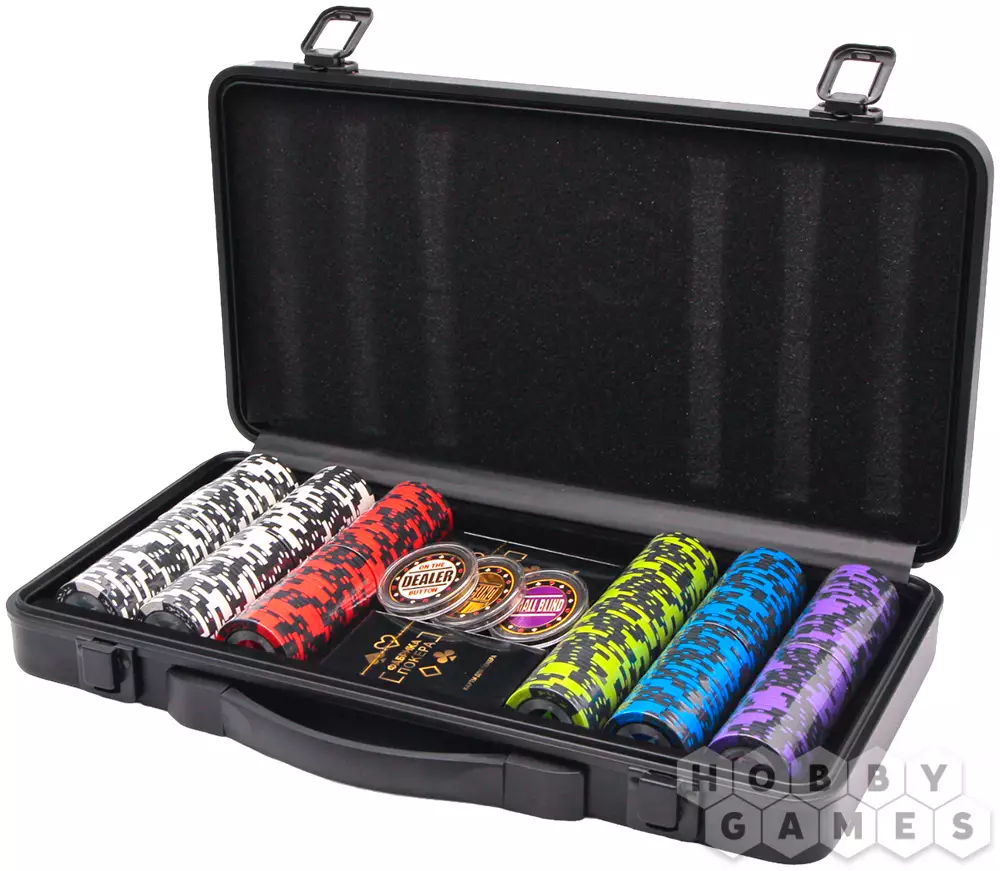 В данном комплекте вы найдёте всё необходимое для игры в классический покер. Внутри вы найдёте 300 стандартных фишек для профессиональной игры (14 г.), фишки блайндов и дилера и 2 колоды игральных карт, соответствующих качеству карт казино.